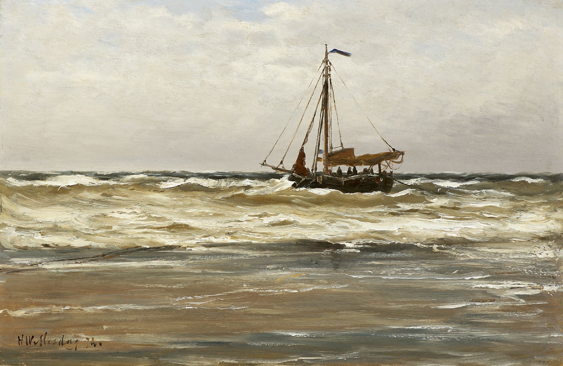 H.W. Mesdag, de zeeschilder van de Haagse School, koos op relatief late leeftijd voor het schildersvak. Na een verblijf in Oosterbeek en Brussel vestigde de schilder zich in 1869 in Den Haag, waar hij direct geboeid werd door het strand, de zee en het leven van de Scheveningse vissers. In een snelle, losse toets en een eindeloze variatie aan bruine, gouden en grijze kleuren bracht hij deze motieven op het doek. Mesdag had een grote productie, als wilde hij alle verloren tijd inhalen. Zijn werk was in Frankrijk zeer geliefd en werd verschillende malen bekroond op de 'Salon' van Parijs.