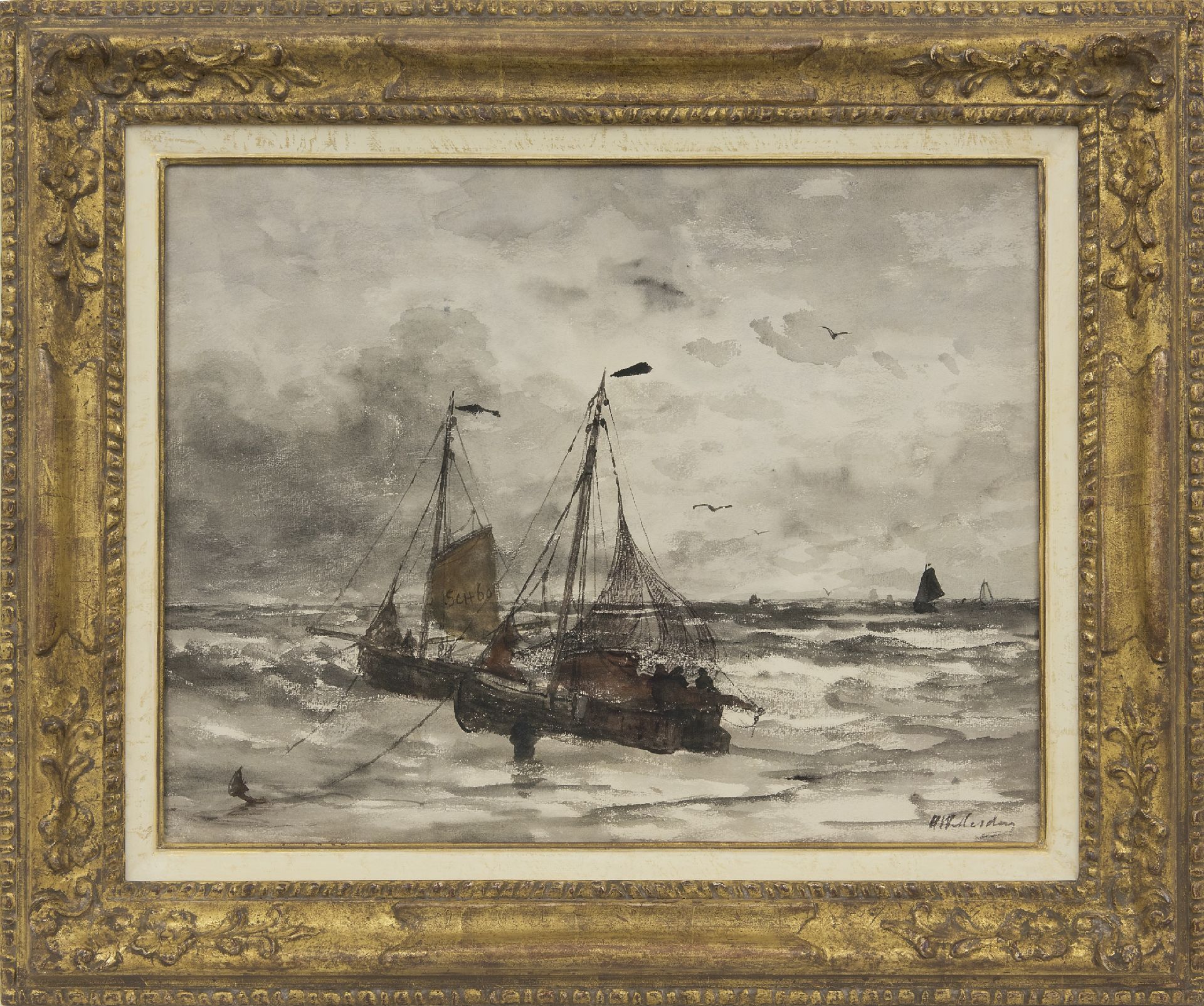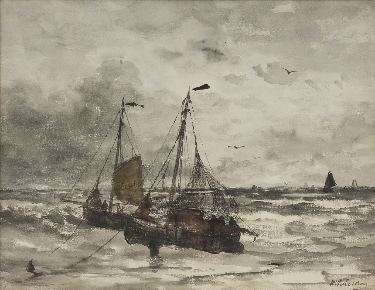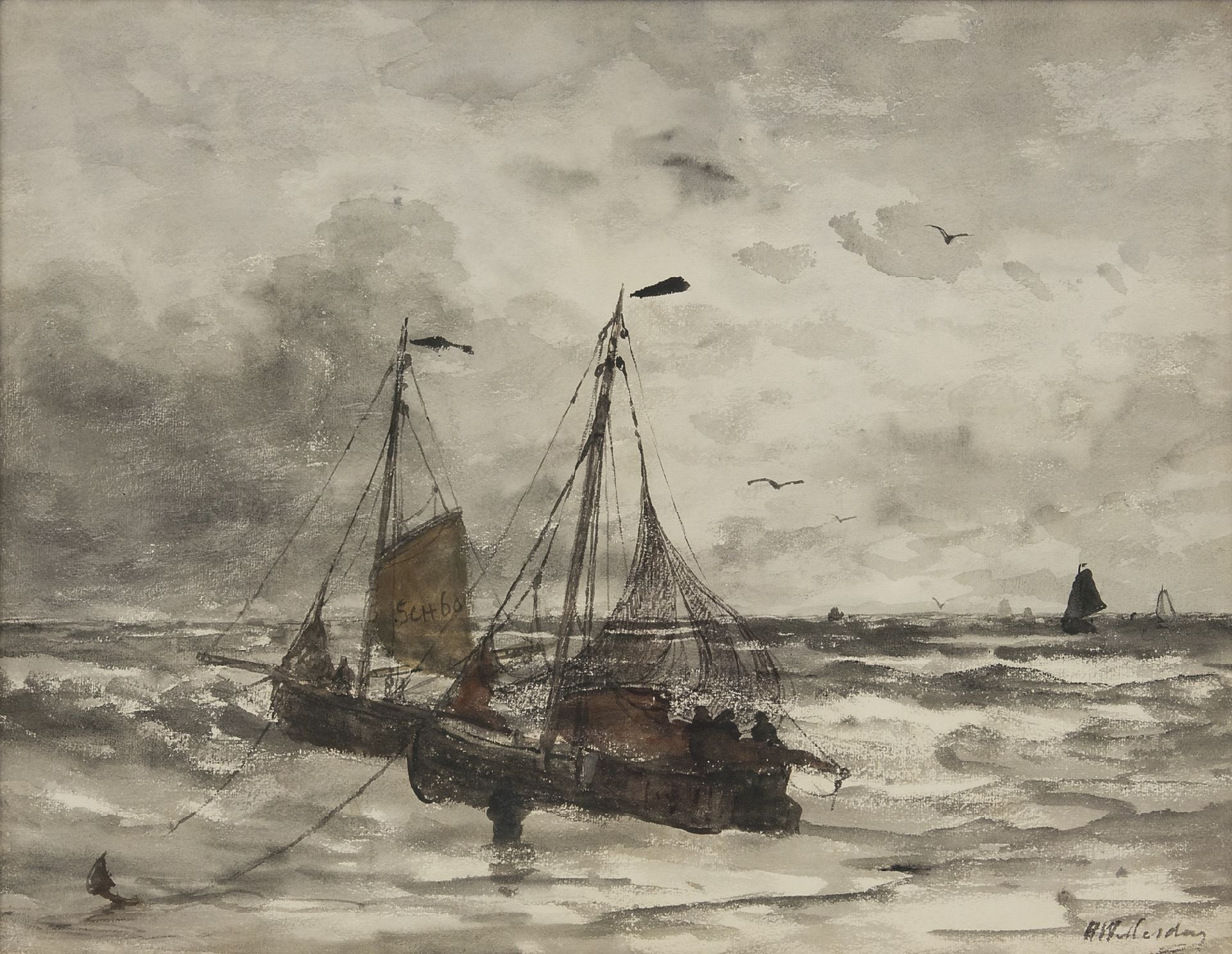 Hendrik Willem Mesdag kunstwerk • aquarel • tekening • voorheen te koop Scheveningse vissersschuiten voor anker in de branding