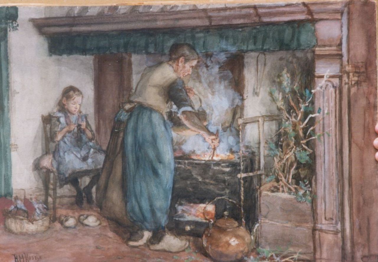 Hendrikus Matheus Horrix kunstwerk • aquarel • tekening • voorheen te koop Vrouw en kind bij de kookpot