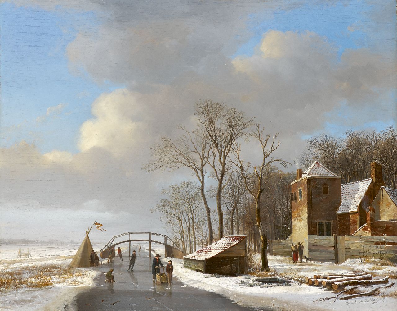 Hendrikus van de Sande Bakhuyzen kunstwerk • schilderij • voorheen te koop Besneeuwd polderlandschap met schaatsers