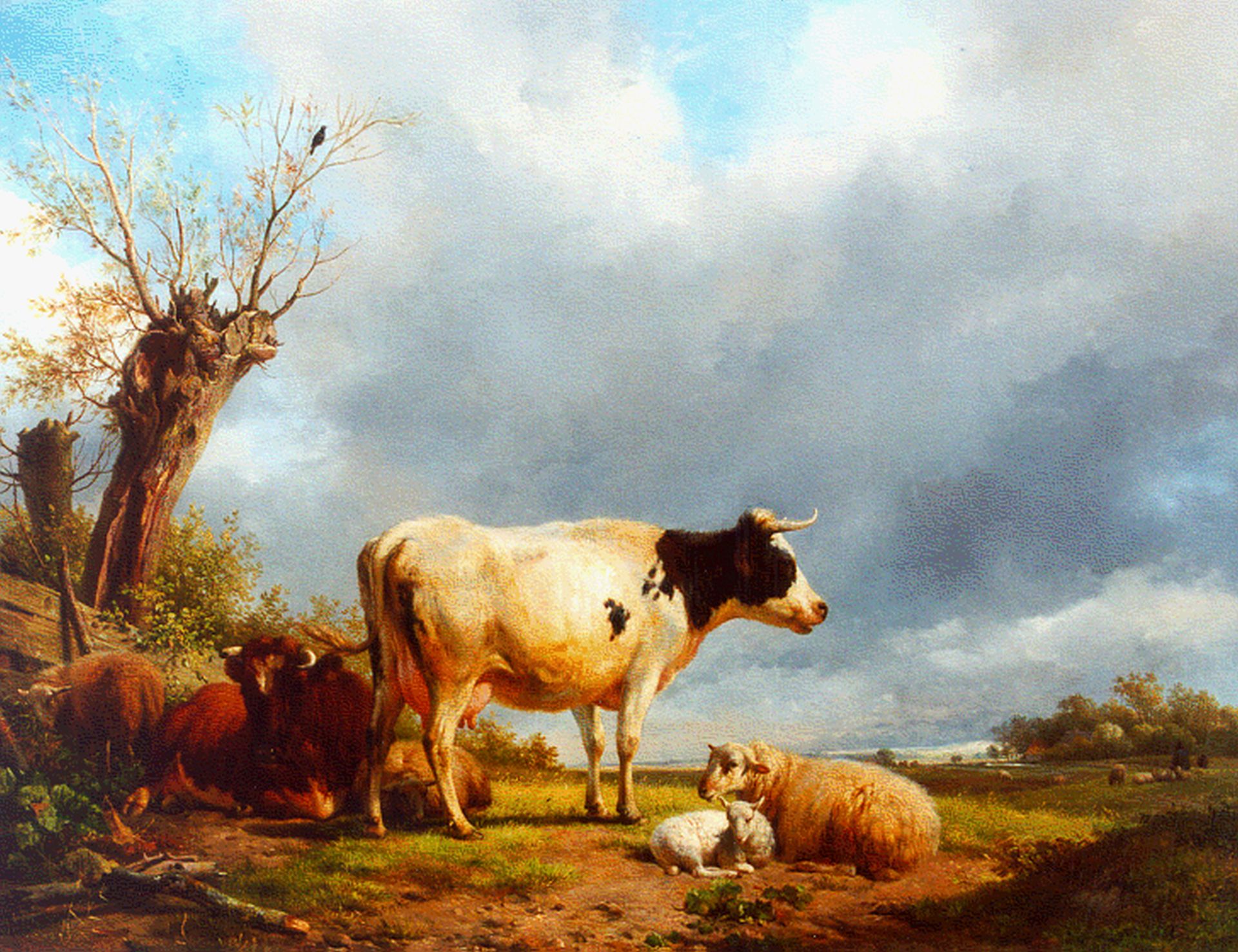 Hendrikus van de Sande Bakhuyzen kunstwerk • schilderij • voorheen te koop Koeien en schapen in een Hollands weidelandschap