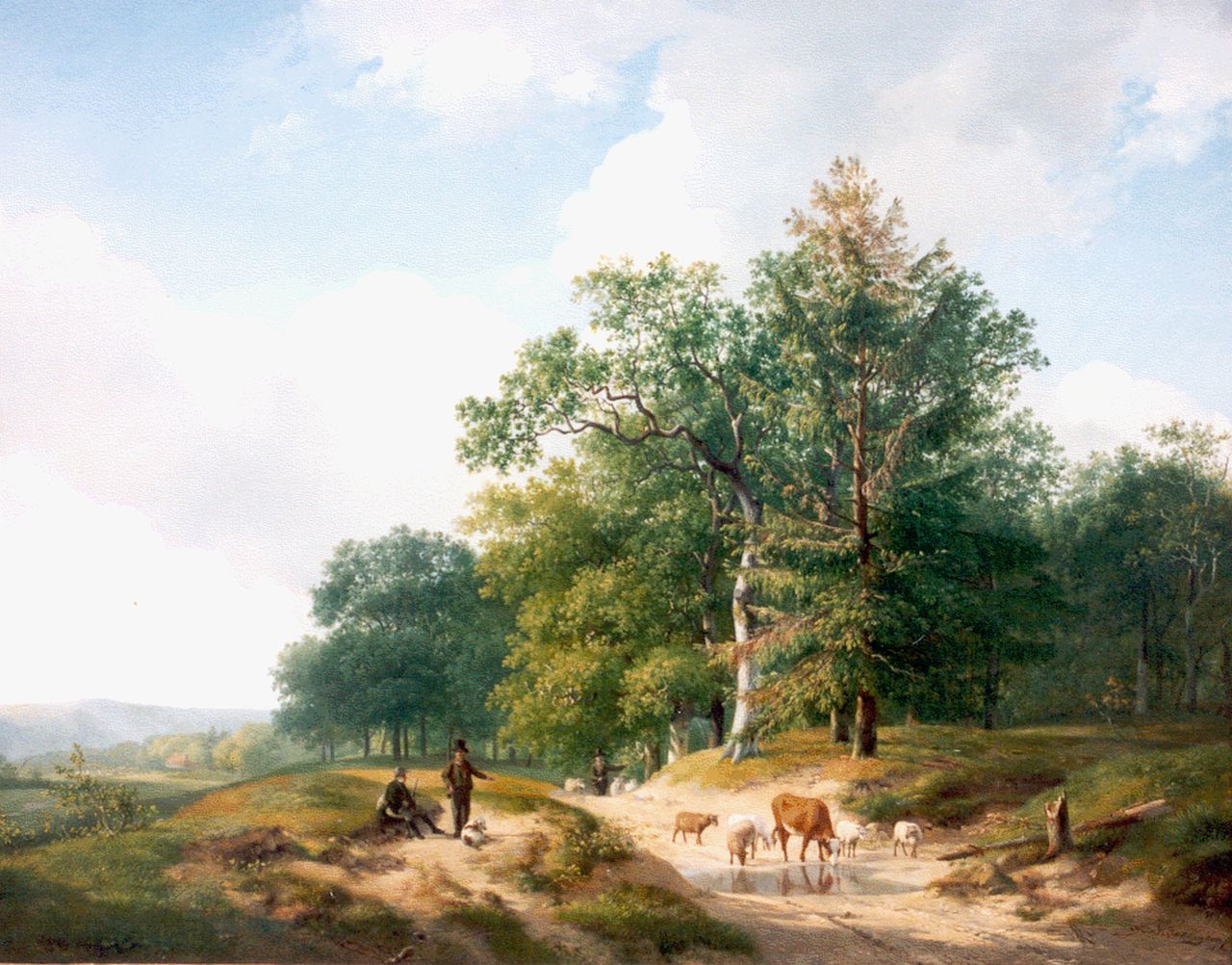 Sande Bakhuyzen H. van de | Hendrikus van de Sande Bakhuyzen, Rustende jagers en boer met vee bij de bosrand, olieverf op paneel 51,4 x 62,2 cm, gesigneerd rechtsonder en gedateerd 1825