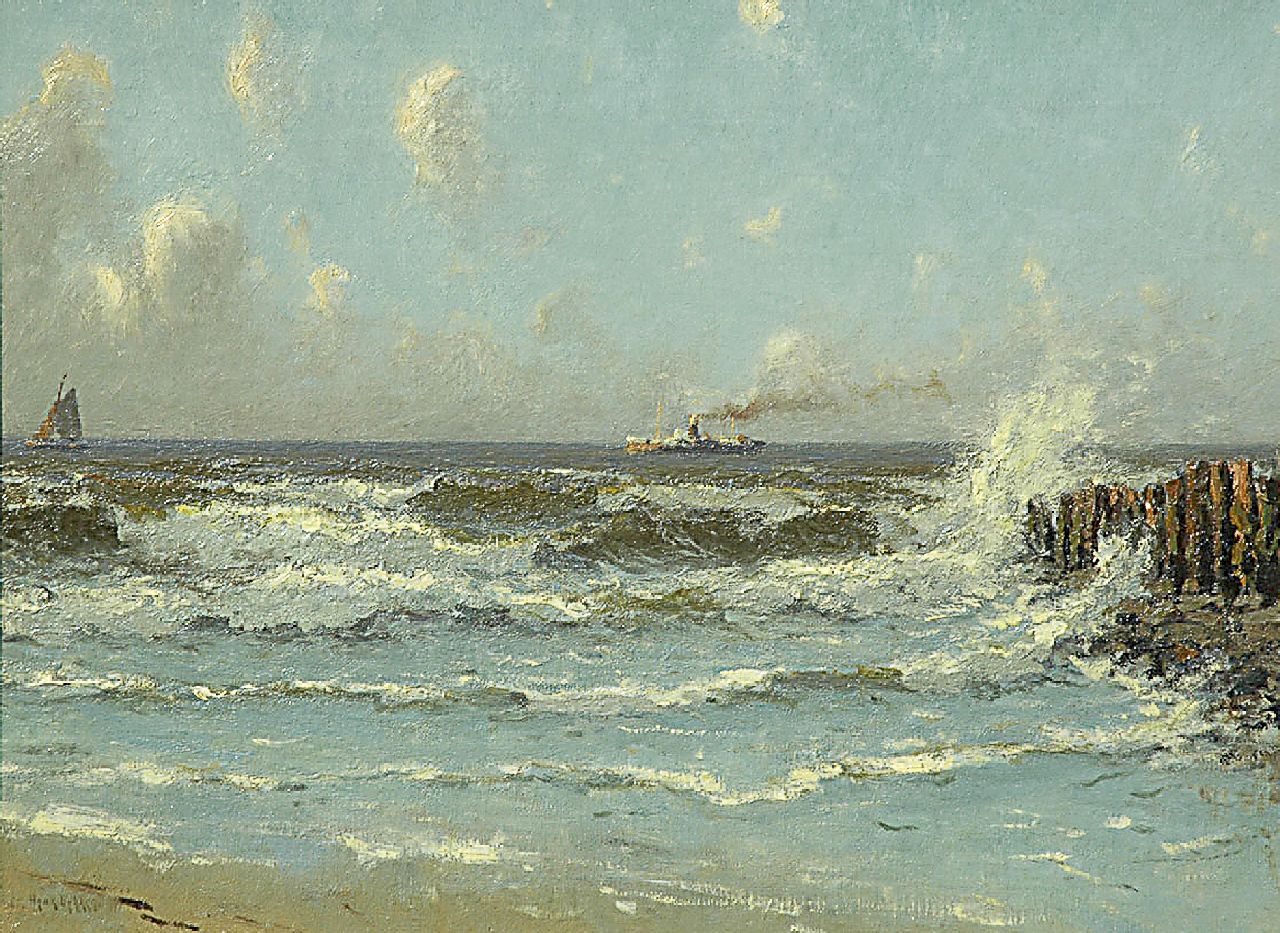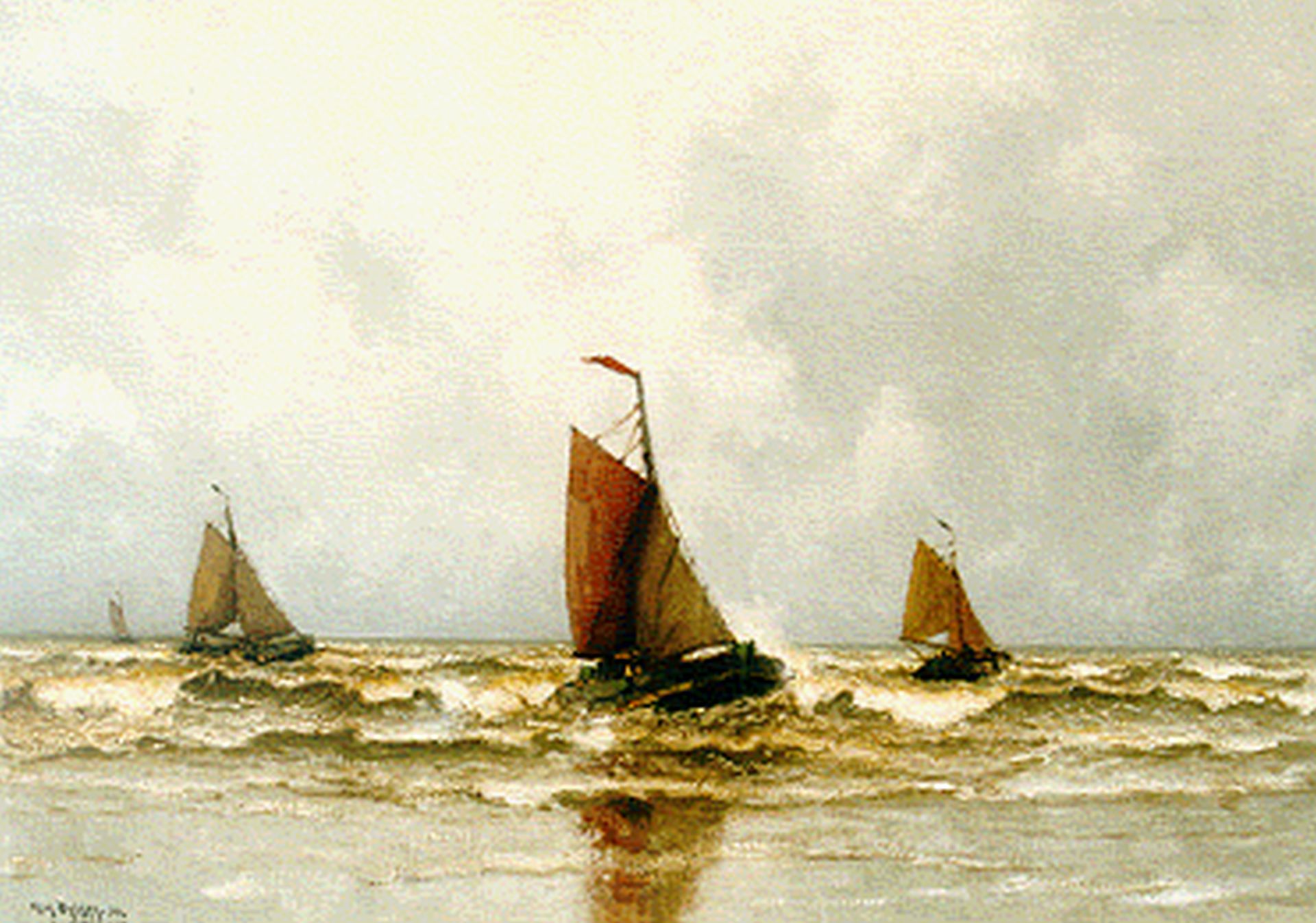 Henk Dekker kunstwerk • schilderij • voorheen te koop Platbodems in de branding