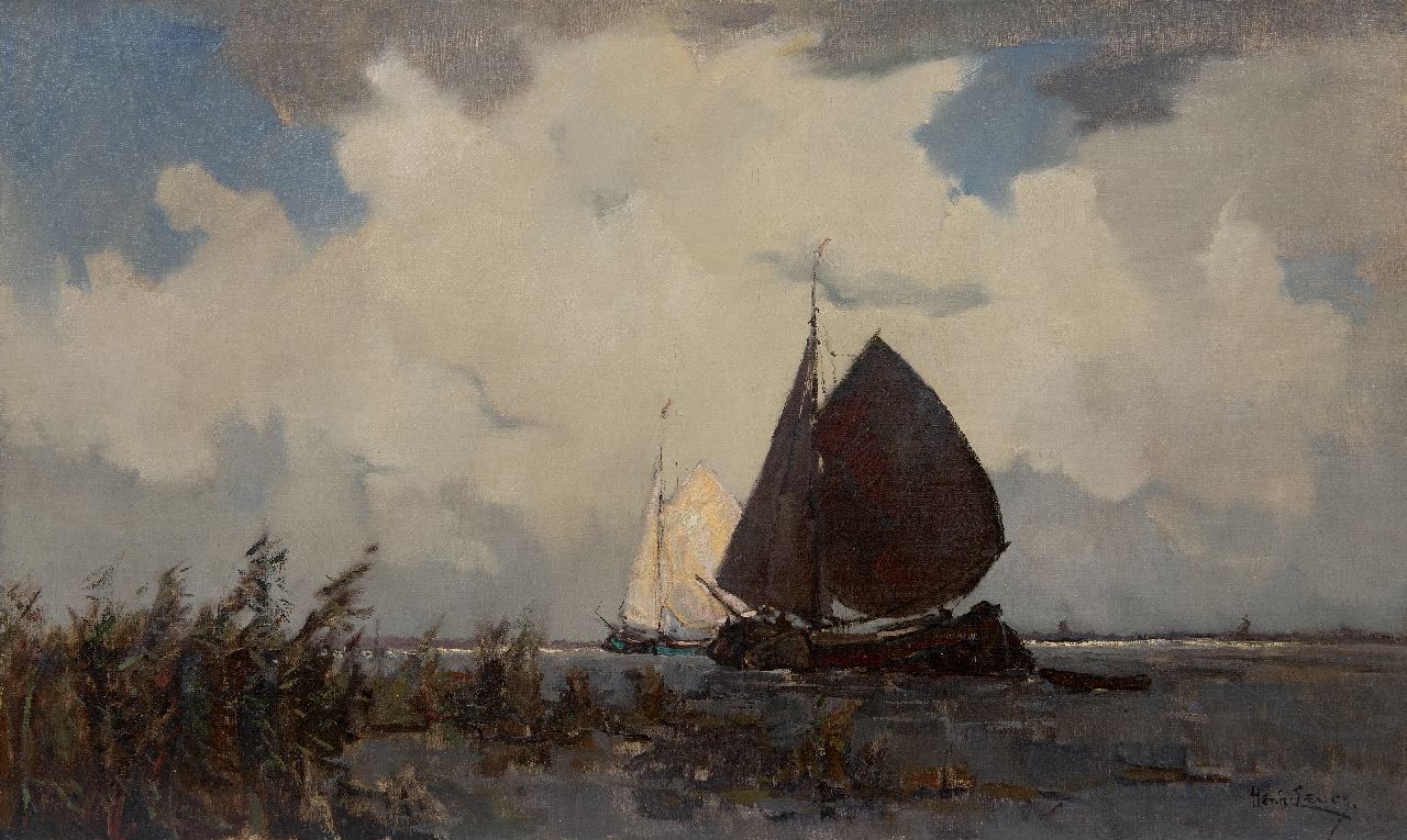 Henk Leurs kunstwerk • schilderij • te koop Zeilende tjalken onder Hollandse wolkenlucht