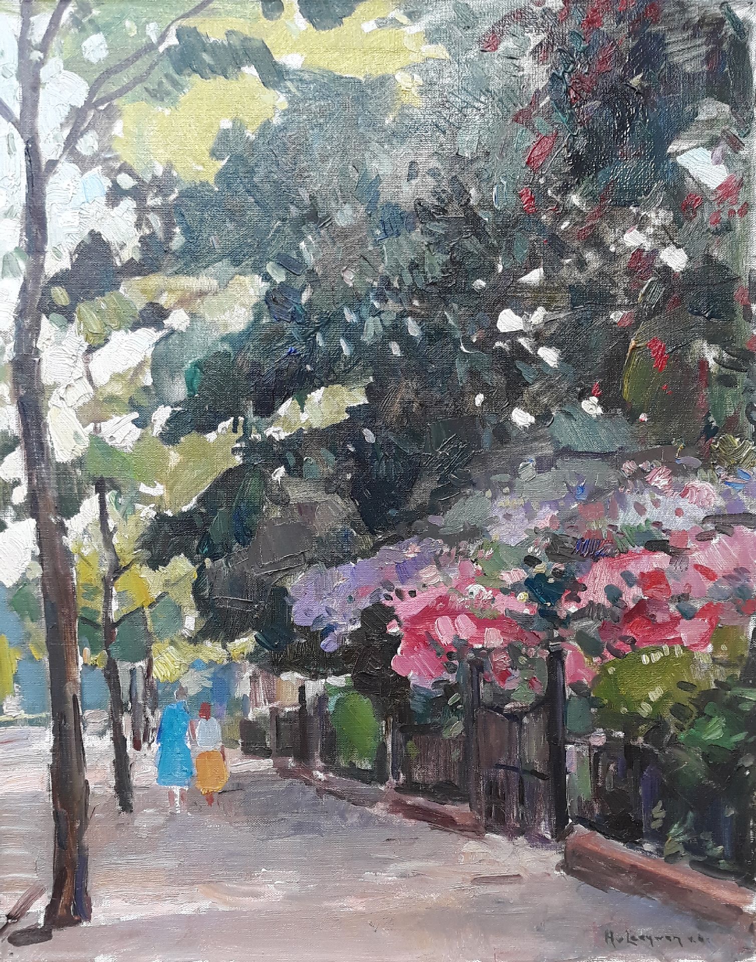 Henk van Leeuwen kunstwerk • schilderij • voorheen te koop Figuren in zonnig laantje