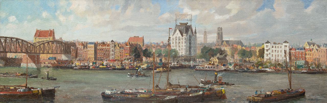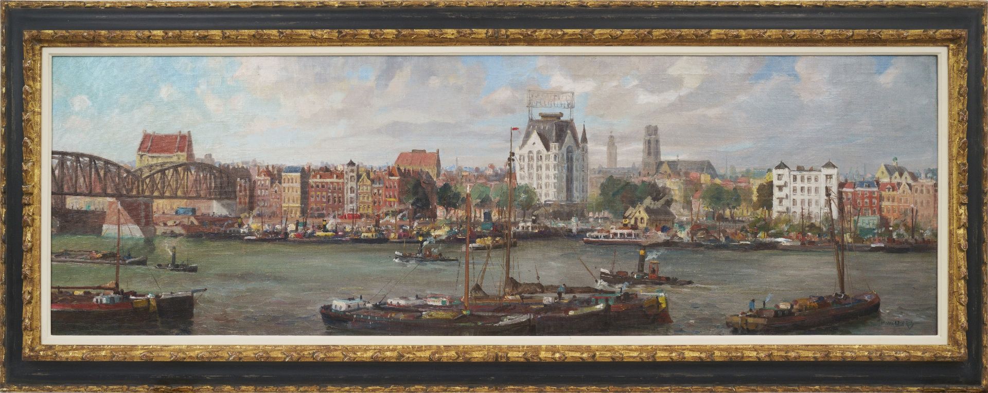 Henk Welther kunstwerk • schilderij • voorheen te koop Panorama van Rotterdam met het Witte Huis en links de Oude Spoorbrug