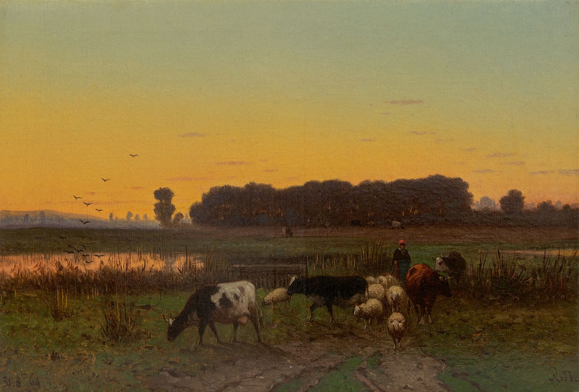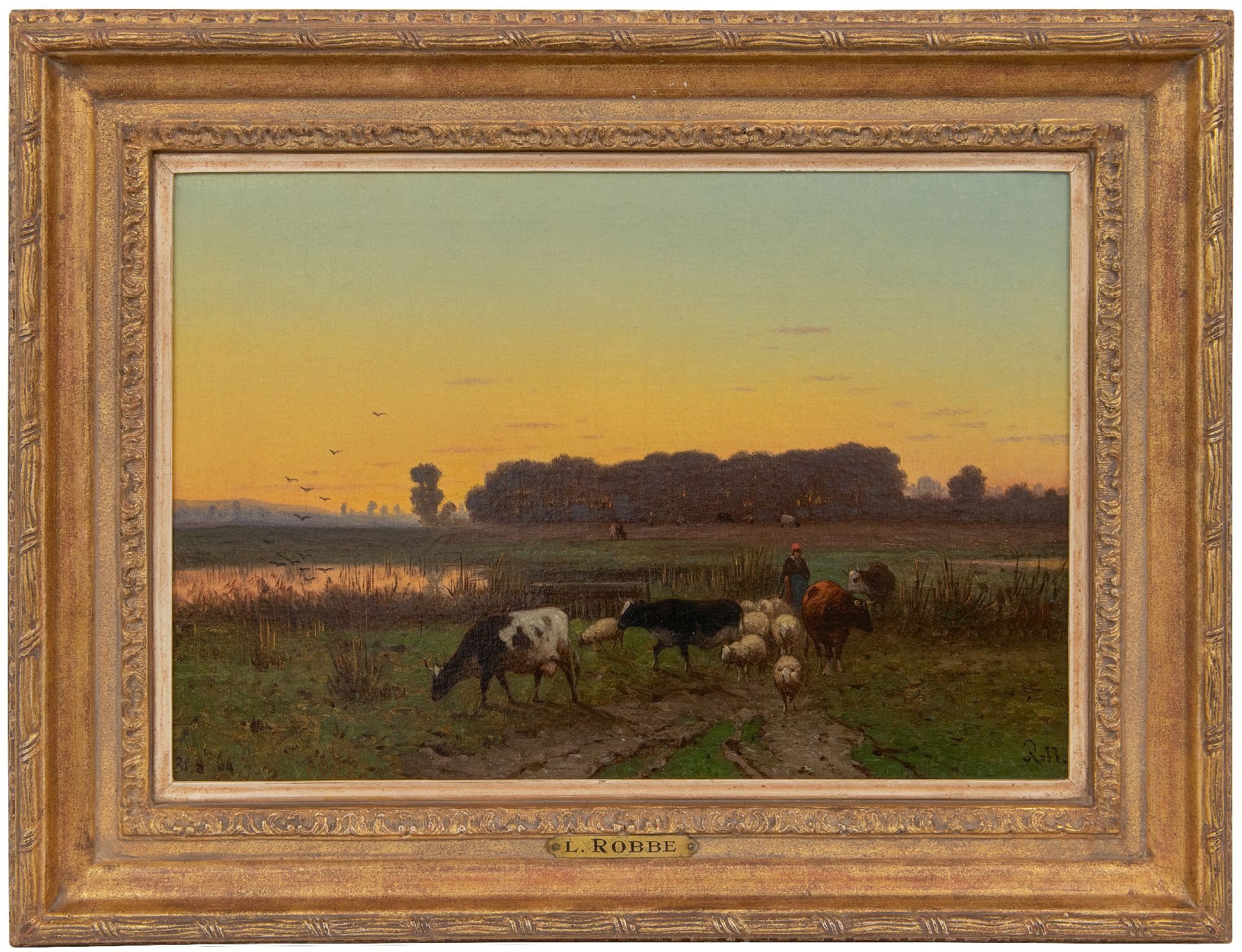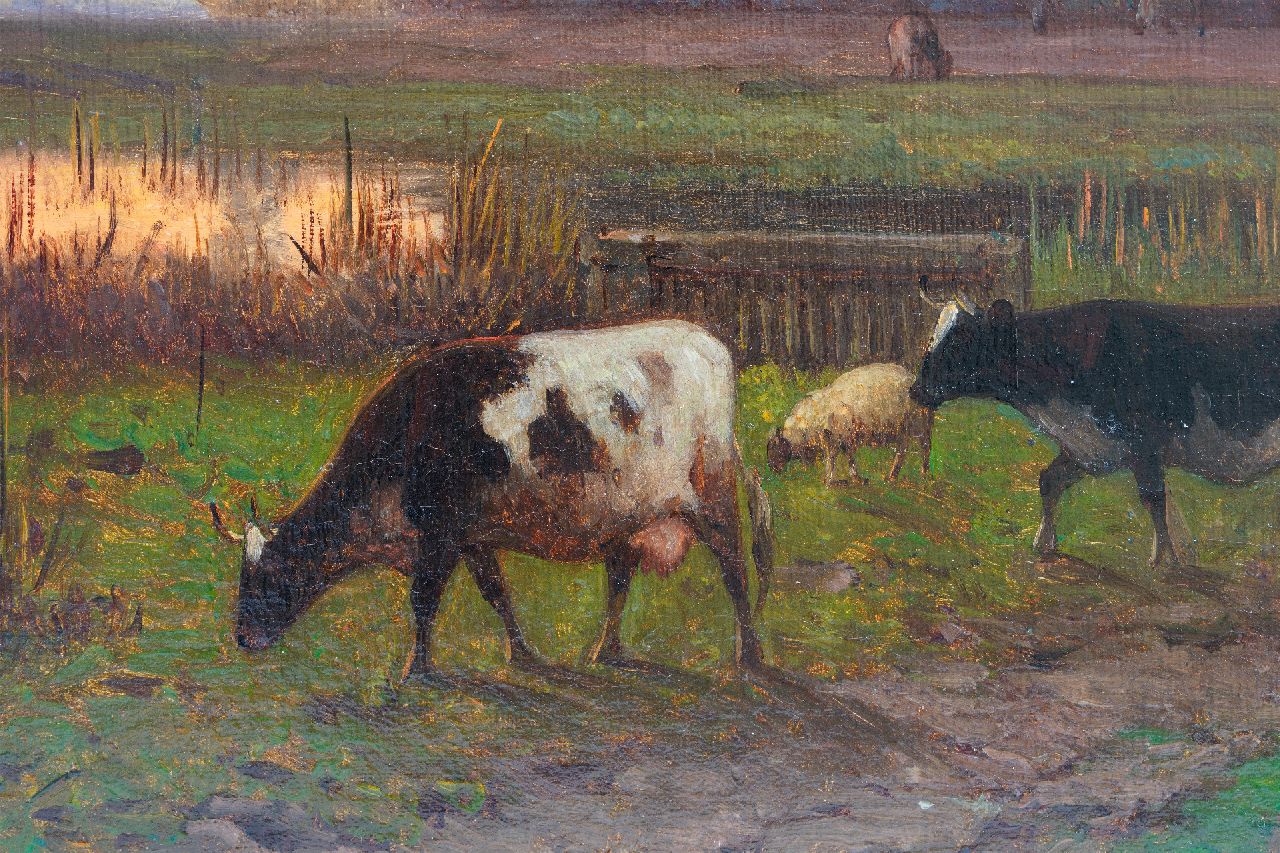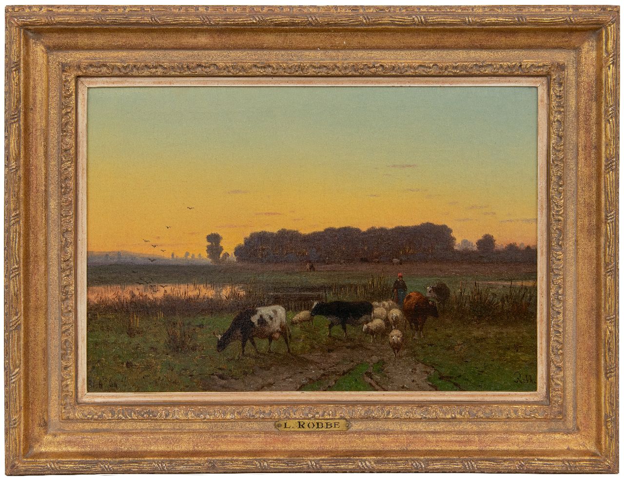 Henri Alexander Robbe kunstwerk • schilderij • te koop Herderin en vee op weg naar huis