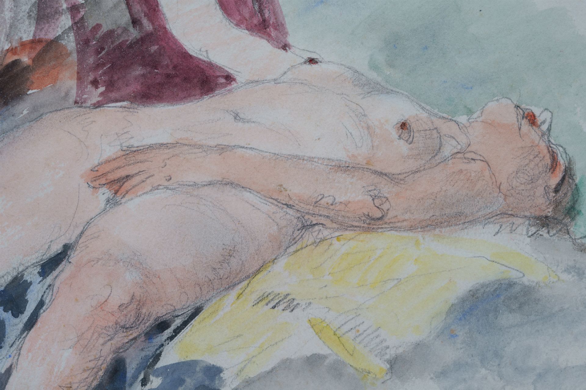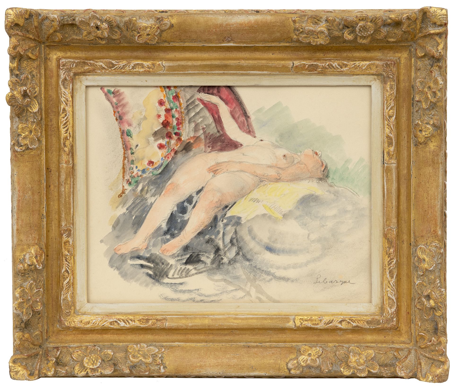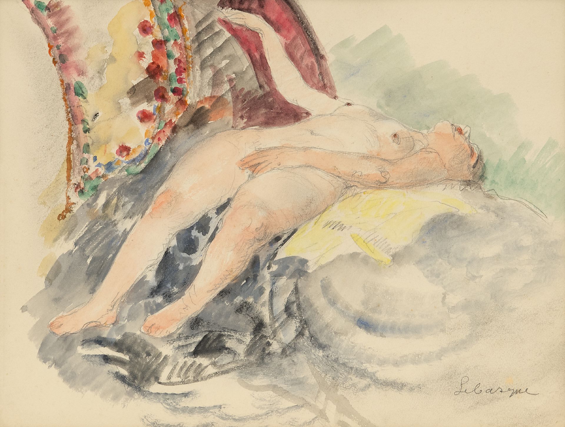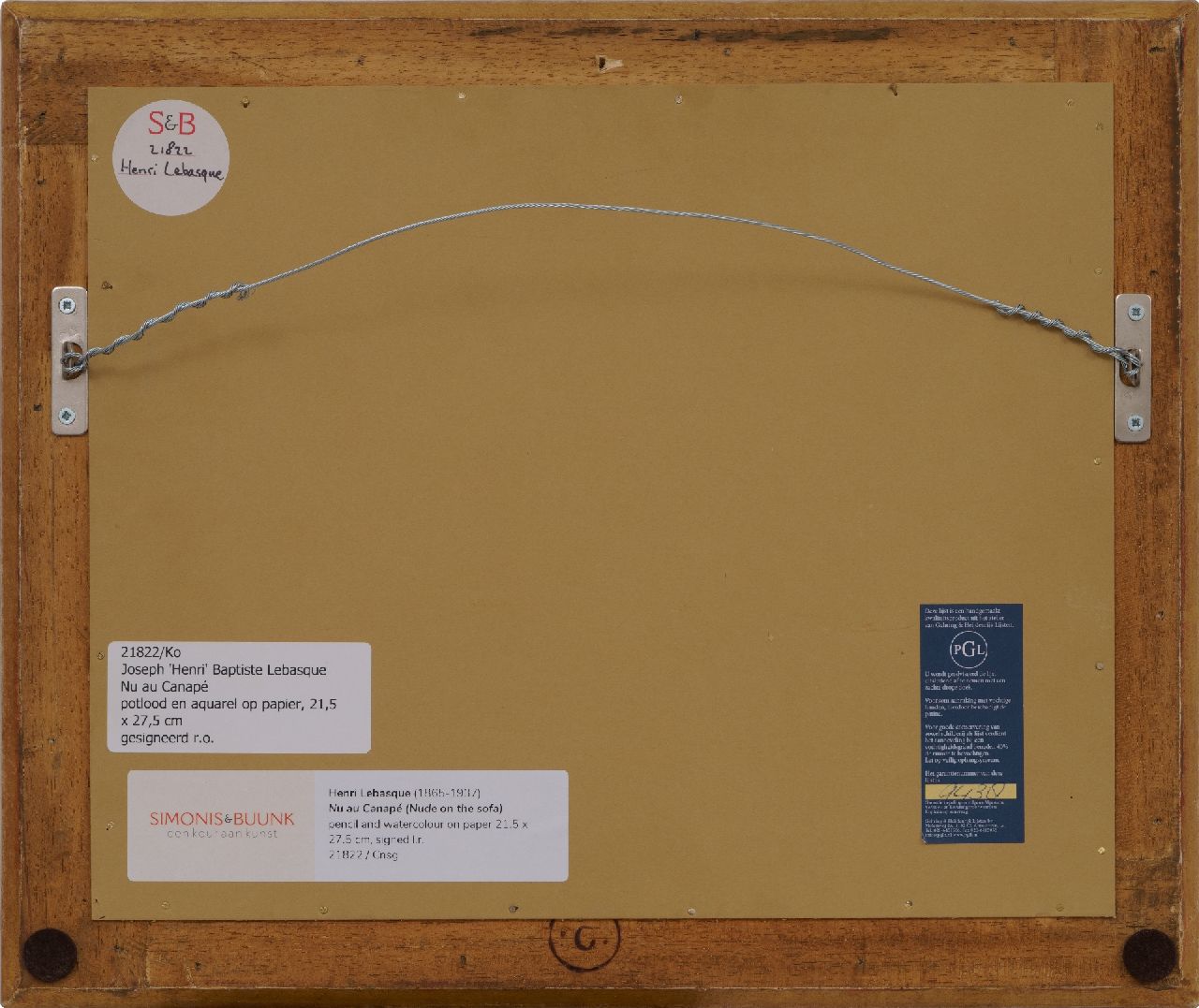 Deze geaquarelleerde tekening laat zien waarom Henri Lebasque bewonderd werd om zijn vrouwelijke naakten. De rust, loomheid, het warme, zuidelijke licht zijn voelbaar. De vrouw is voorzichtig uitgetekend met potlood en daarna heeft hij haar vormen geaccentueerd met aquarelverf in zachte, heldere kleuren. De schilder haalt daarmee de toeschouwer binnen in een intieme wereld vol verleiding. Het werk van de impressionist en neo-impressionist Lebasque weerspiegelt het licht, de warmte en de kleuren van Zuid-Frankrijk. Na een opleiding aan de academie werd hij in Parijs een leerling van de figuur- en historieschilder Léon Bonnat. In de jaren 90 ontmoette hij de neo-impressionisten Pissarro, Signac en Seurat, die een grote invloed zouden hebben op zijn techniek en kleurgebruik. Behalve in Parijs was hij In de zomermaanden regelmatig te vinden aan de Côte d'Azur, samen met o.a.Pierre Bonnard. Het bevalt hem daar zo, dat hij in zich in 1924 vestigt in het dorpje Le Cannet. Lebasque zou, samen met onder anderen Henri Matisse, in 1903 een van de oprichters zijn van de Parijse Salon d’Automne die jaarlijks gehouden werd in het Petit Palais.