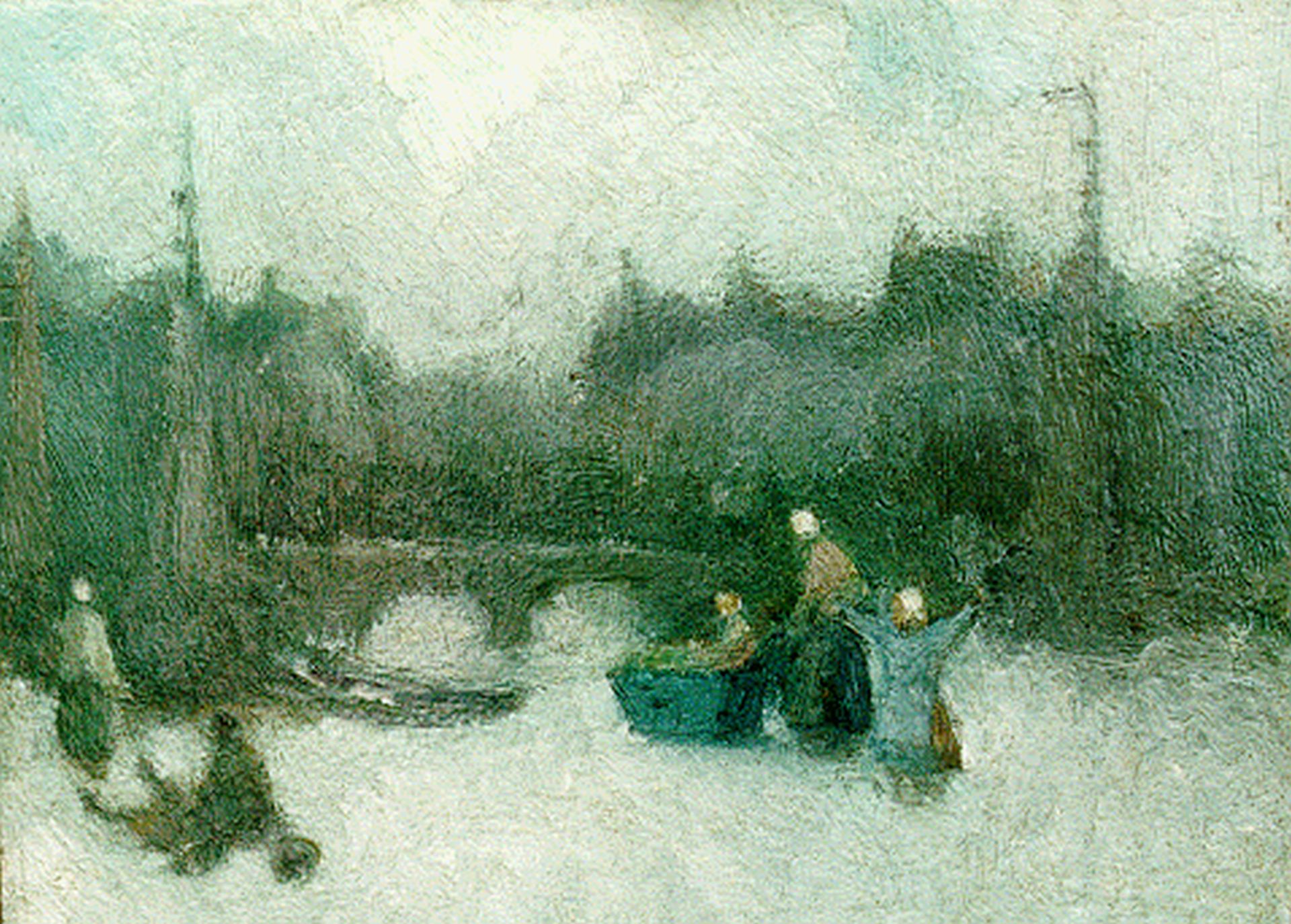 Henri van Daalhoff kunstwerk • schilderij • voorheen te koop IJsvertier op bevroren gracht