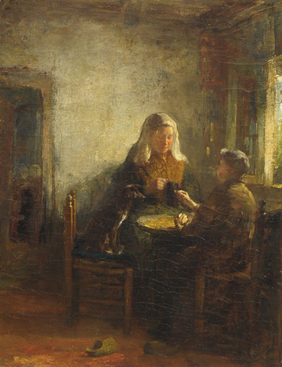 Henricus Joannes Mélis kunstwerk • schilderij • voorheen te koop Zeeuwse vrouw met jongen en hondje
