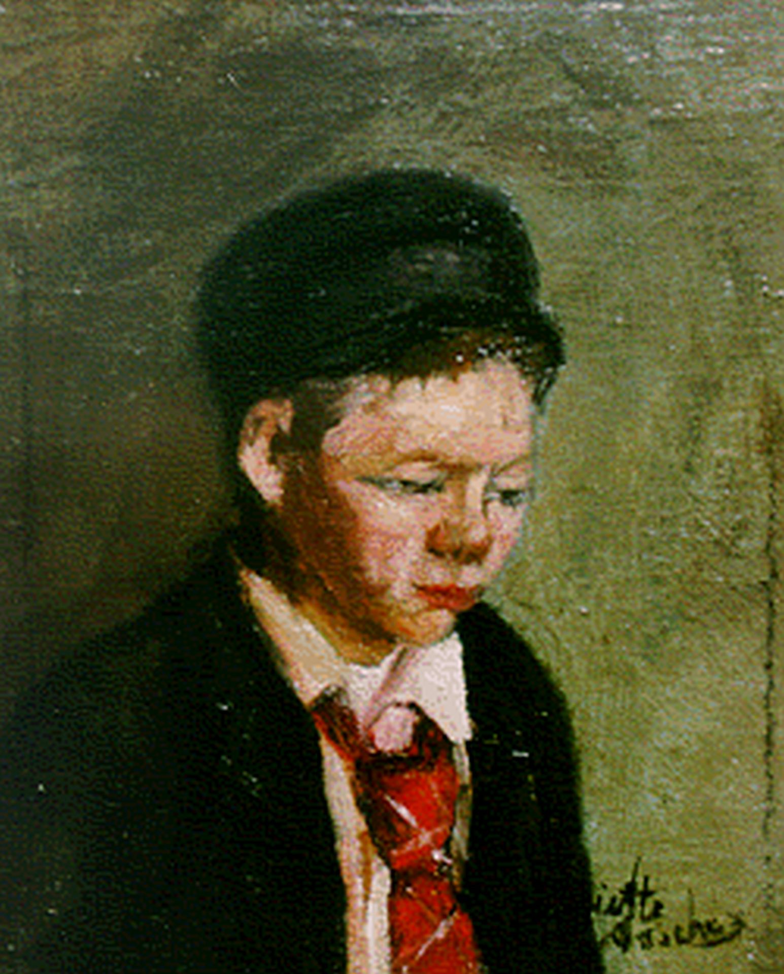 Henriëtte Asscher kunstwerk • schilderij • voorheen te koop Portret van jongetje met das en hoed
