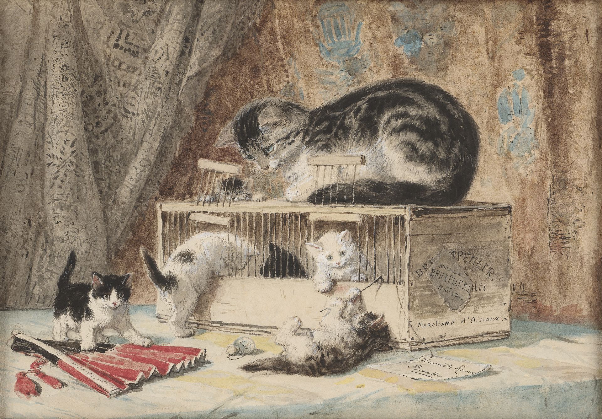 Henriette Ronner kunstwerk • aquarel • tekening • voorheen te koop Moederpoes en kittens spelend met een vogelkooi