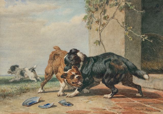 Henriette Ronner kunstwerk • aquarel • tekening • voorheen te koop Moederpoes en kittens spelend met een vogelkooi