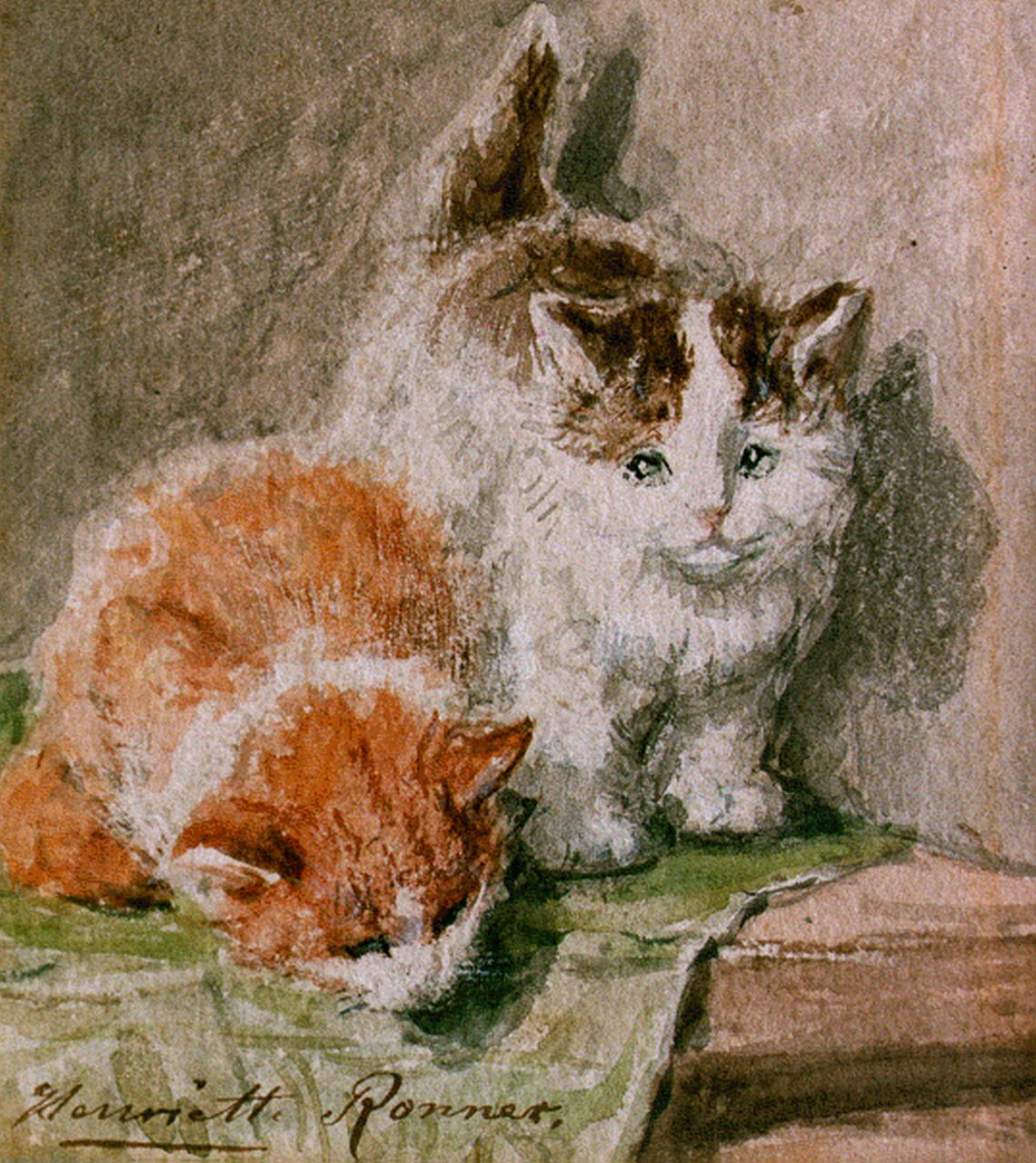 Henriette Ronner kunstwerk • aquarel • tekening • voorheen te koop Twee katjes op een tafel