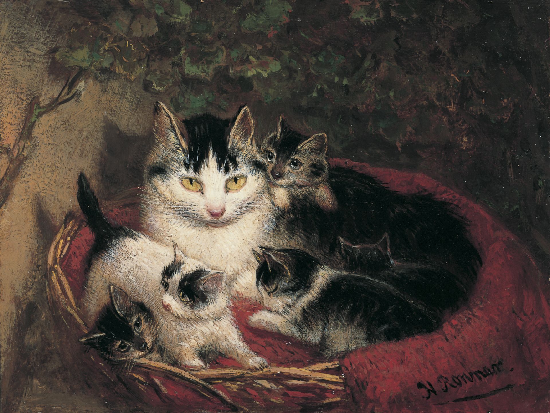 Henriette Ronner-Knip schilderde aanvankelijk dierstukken en honden, maar na 1870 specialiseerde ze zich in het schilderen van poezen. Feilloos wist ze de textuur van vachten, ogen en kleuren weer te geven en trof ze de soms rustige, soms speelse en onderzoekende aard van poezen. Haar werk was vooral geliefd bij de opkomende bourgeoisie in de 19e eeuw. Zij verbeeldt haar dieren dan ook al spelend, slapend en kruipend op en over de kostbare meubels en luxueuze stoffen die bij deze rijk geworden burgers zo in trek waren. Zowel in Nederland als in België werd zij vanwege haar werk geridderd.