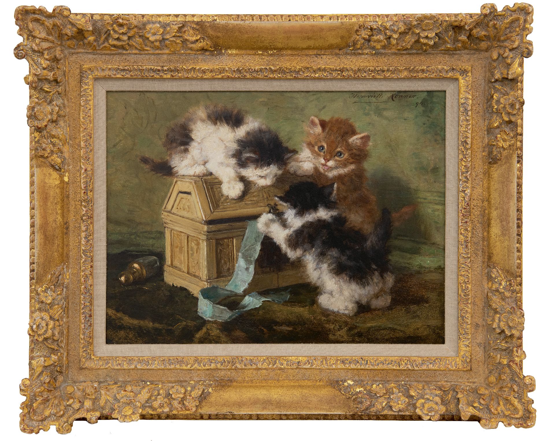 Henriette Ronner kunstwerk • schilderij • te koop Drie jonge poesjes spelend met een brievenkistje