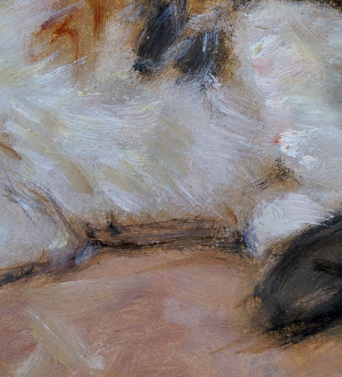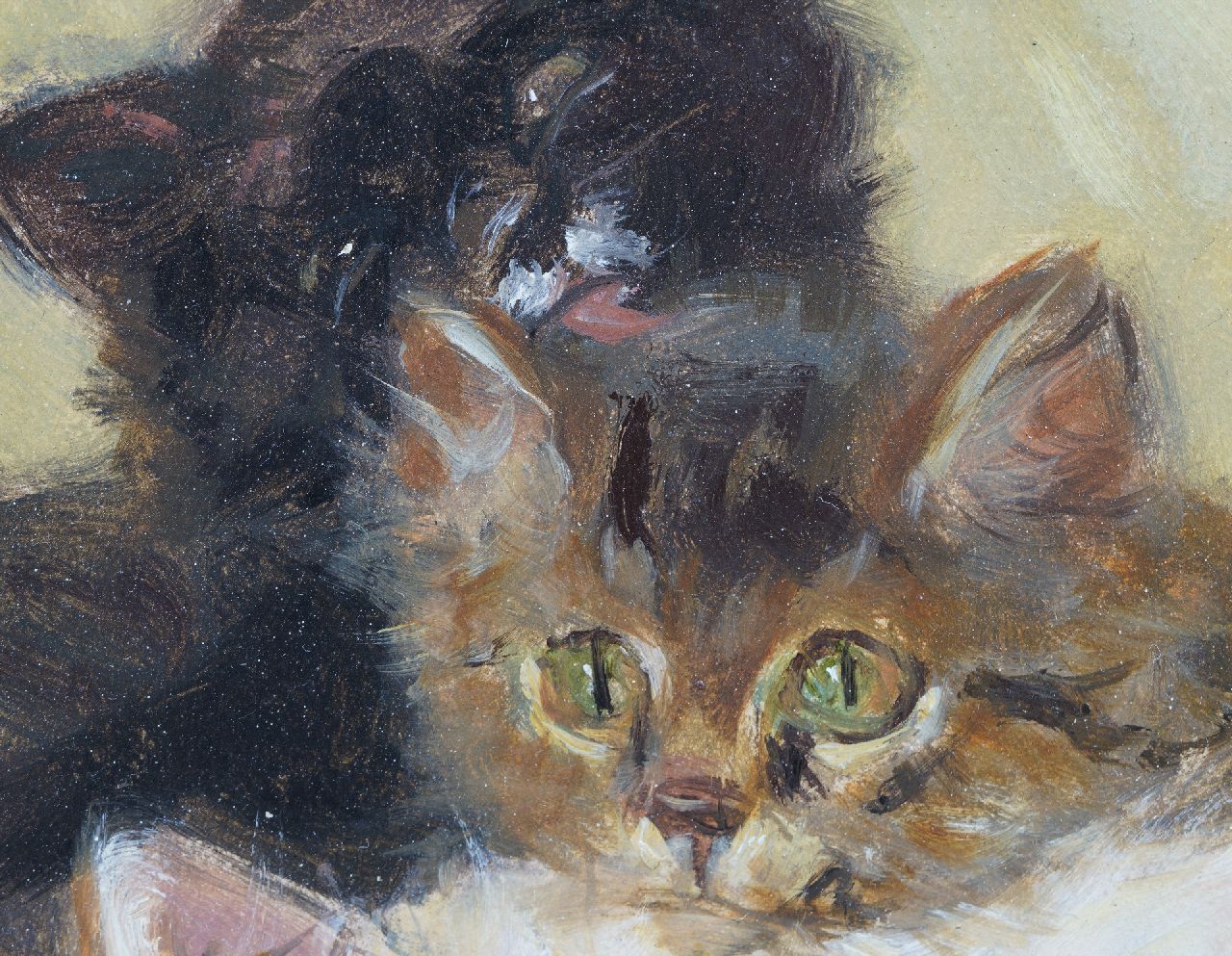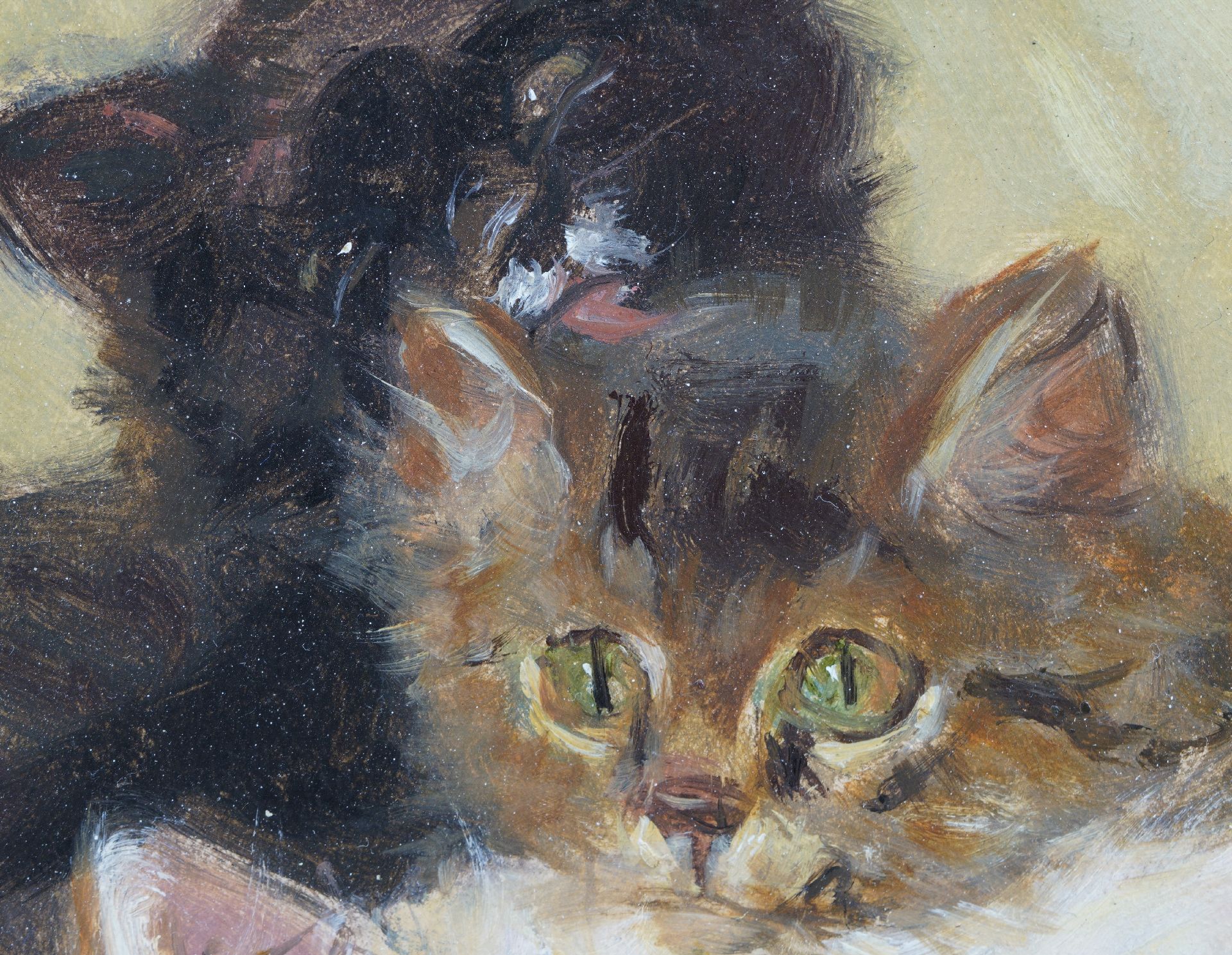 Henriette Ronner-Knip schilderde aanvankelijk dierstukken en honden, maar na 1870 specialiseerde ze zich in het schilderen van poezen. Feilloos wist ze de textuur van vachten, ogen en kleuren weer te geven en trof ze de soms rustige, soms speelse en onderzoekende aard van poezen. Haar werk was vooral geliefd bij de opkomende bourgeoisie in de 19e eeuw. Zij verbeeldt haar dieren dan ook al spelend, slapend en kruipend op en over de kostbare meubels en luxueuze stoffen die bij deze rijk geworden burgers zo in trek waren. Zowel in Nederland als in België werd zij vanwege haar werk geridderd.
