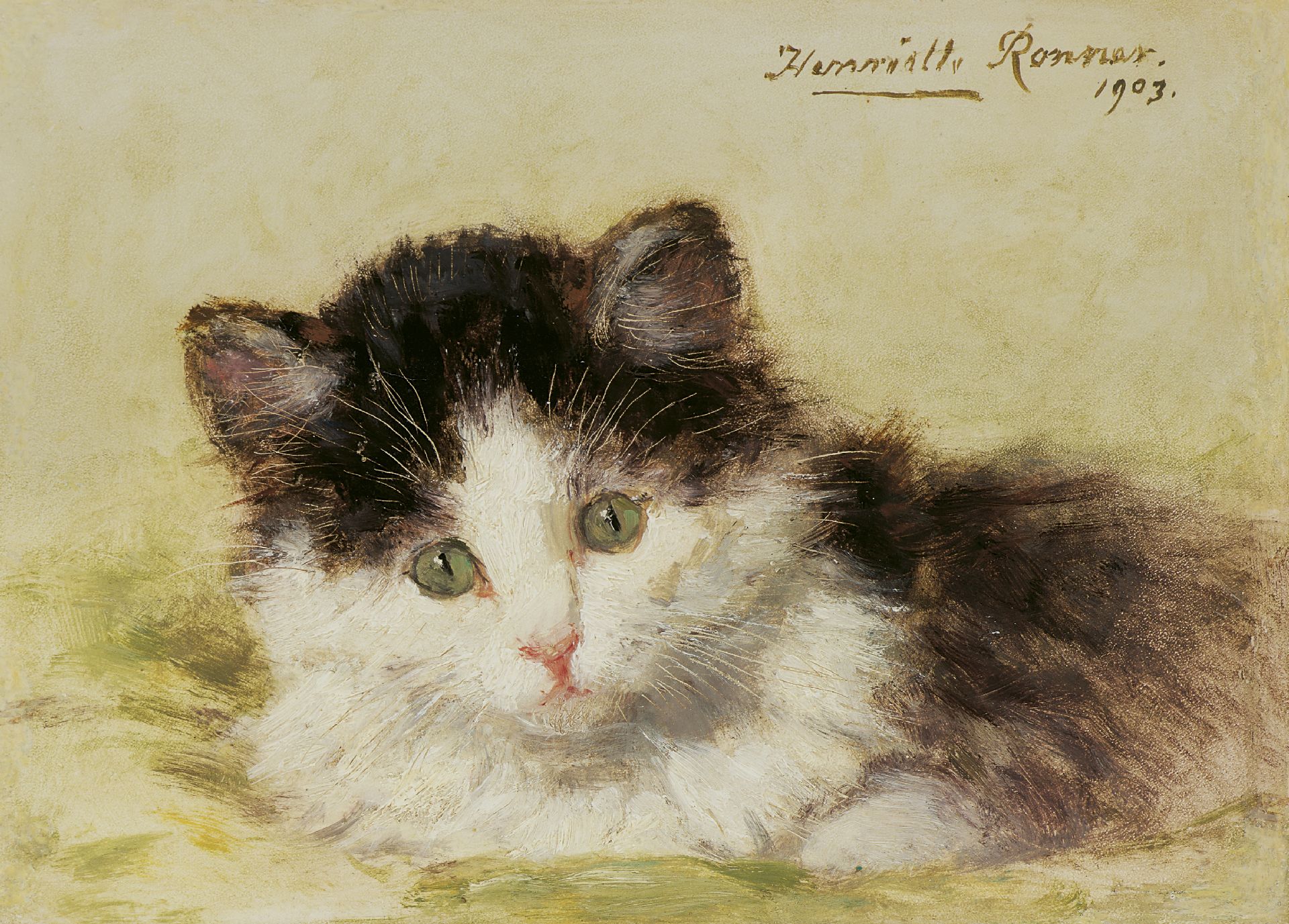 Henriette Ronner-Knip schilderde aanvankelijk dierstukken en honden, maar na 1870 specialiseerde ze zich in het schilderen van poezen. Feilloos wist ze de textuur van vachten, ogen en kleuren weer te geven en trof ze de soms rustige, soms speelse en onderzoekende aard van poezen. Haar werk was vooral geliefd bij de opkomende bourgeoisie in de 19e eeuw. Zij verbeeldt haar dieren dan ook al spelend, slapend en kruipend op en over de kostbare meubels en luxueuze stoffen die bij deze rijk geworden burgers zo in trek waren. Zowel in Nederland als in België werd zij vanwege haar werk geridderd.