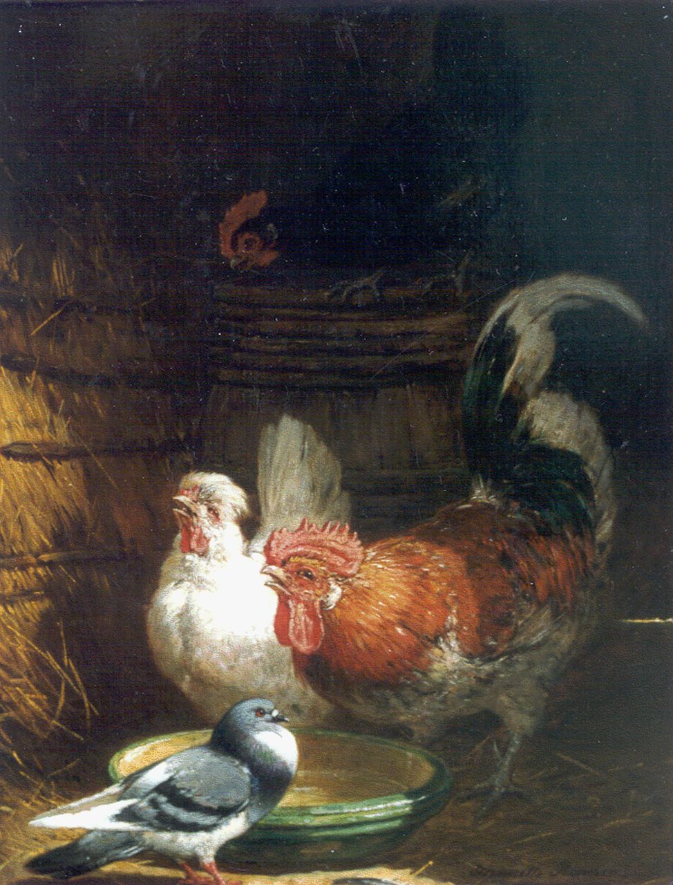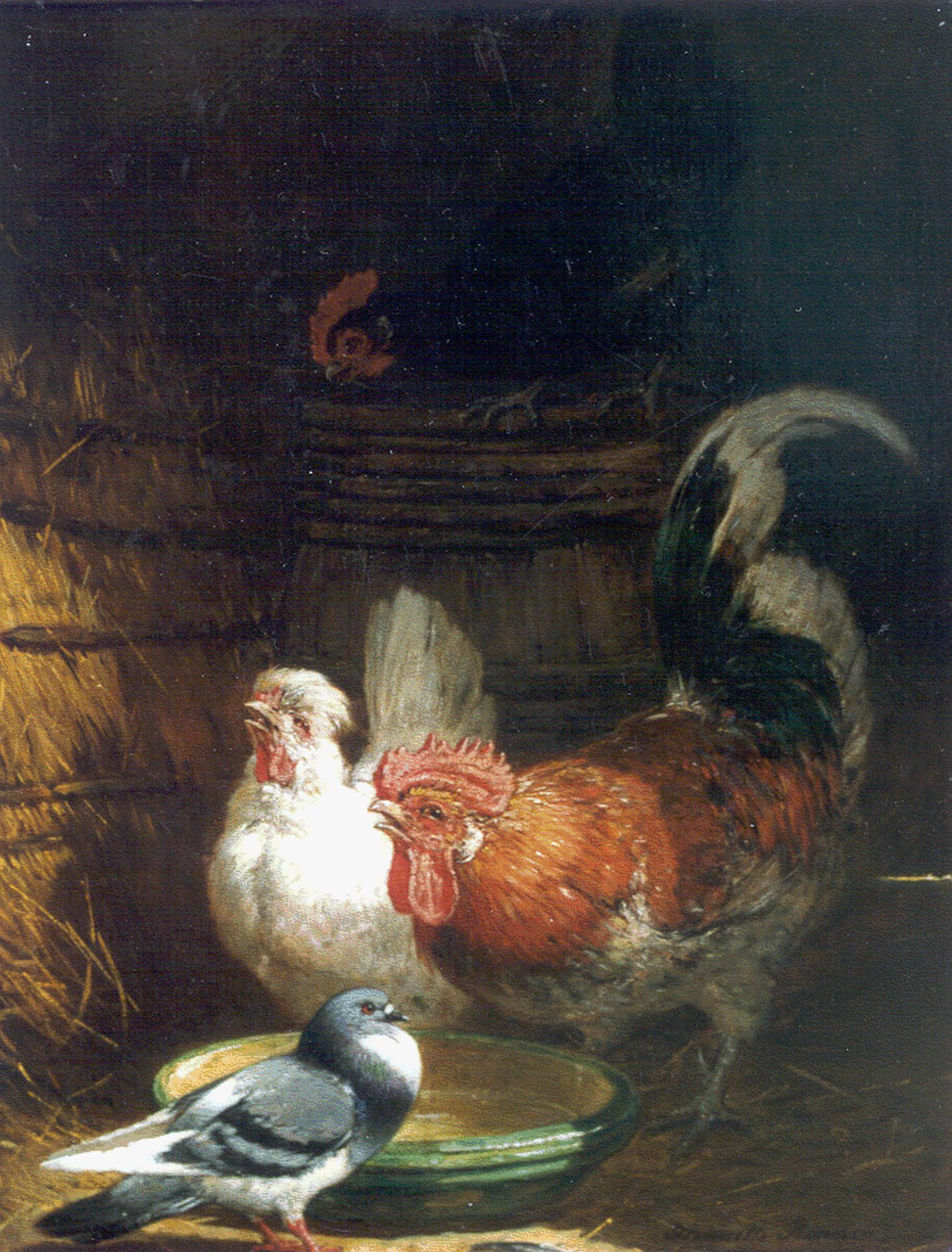 Henriette Ronner kunstwerk • schilderij • voorheen te koop Kippen en duif bij een drinkbak