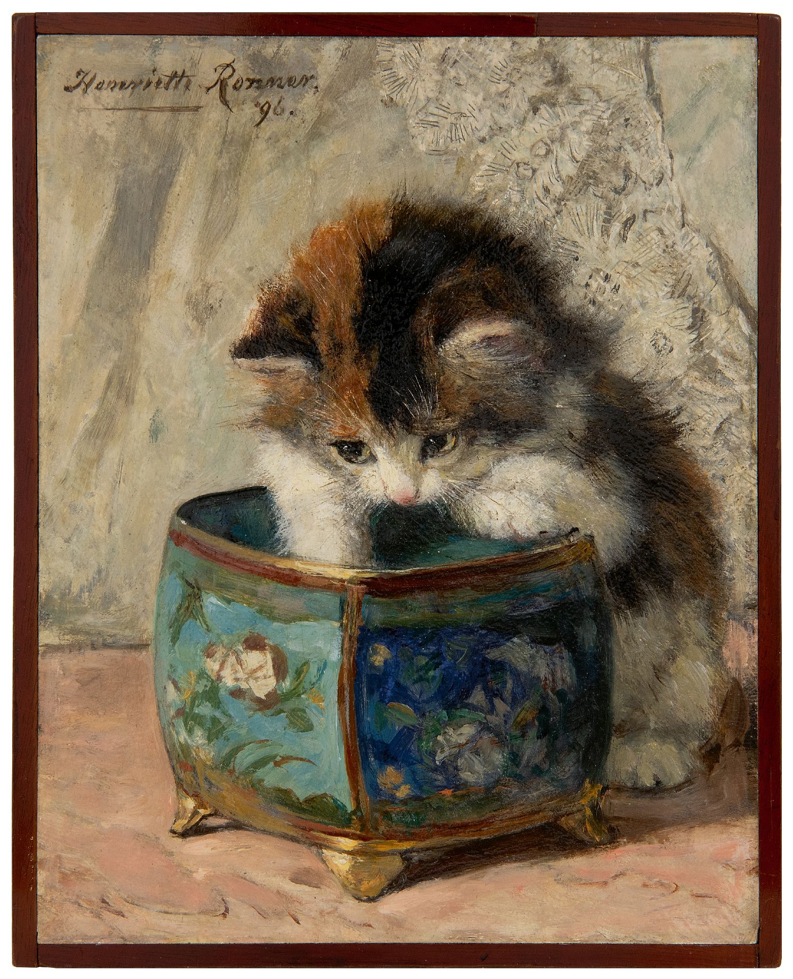 Henriette Ronner-Knip schilderde aanvankelijk dierstukken en honden, maar na 1870 specialiseerde ze zich in het schilderen van poezen. Feilloos wist ze de textuur van vachten, ogen en kleuren weer te geven en trof ze de soms rustige, soms speelse en onderzoekende aard van poezen. Haar werk was vooral geliefd bij de opkomende bourgeoisie in de 19e eeuw. Zij verbeeldt haar dieren dan ook al spelend, slapend en kruipend op en over de kostbare meubels en luxueuze stoffen die bij deze rijk geworden burgers zo in trek waren. Zowel in Nederland als in België werd zij vanwege haar werk geridderd.