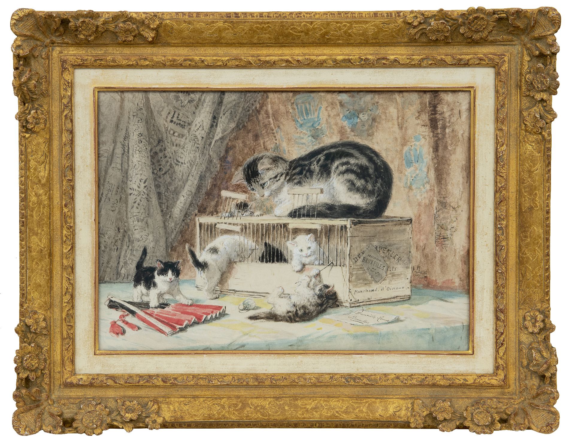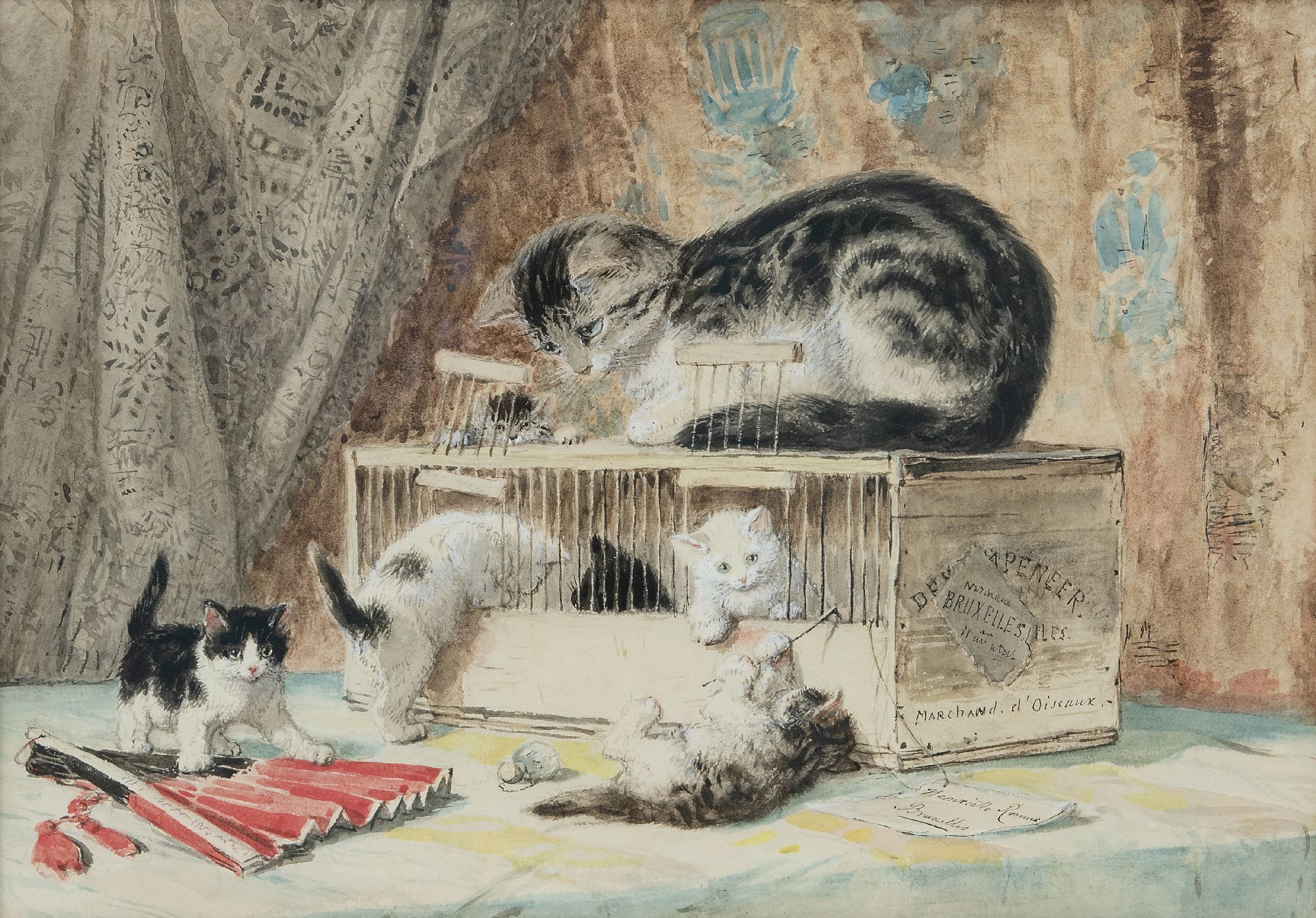 Henriette Ronner kunstwerk • aquarel • tekening • voorheen te koop Moederpoes en kittens spelend met een vogelkooi
