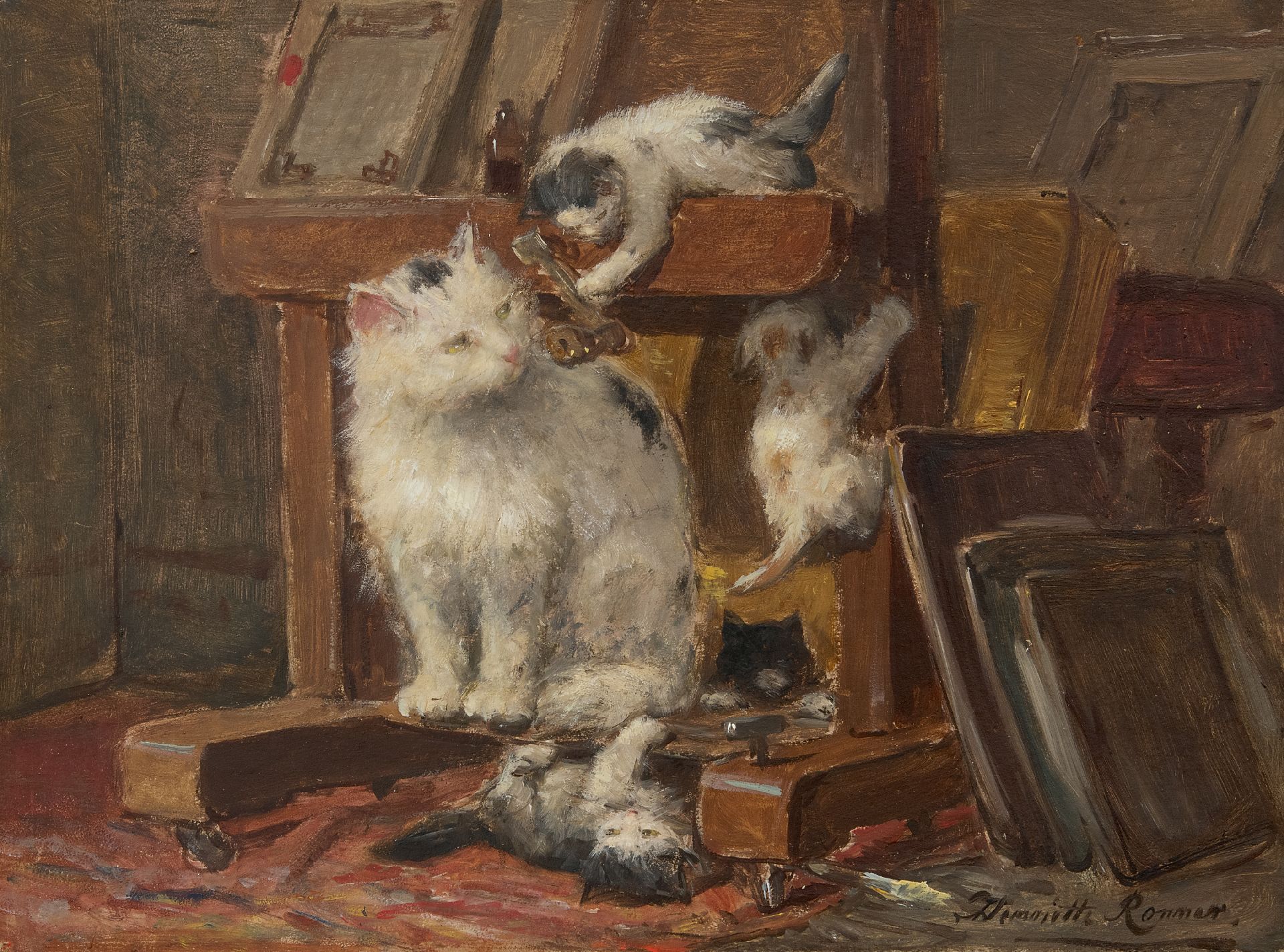 Henriette Ronner kunstwerk • schilderij • voorheen te koop Moederpoes met kittens in het atelier