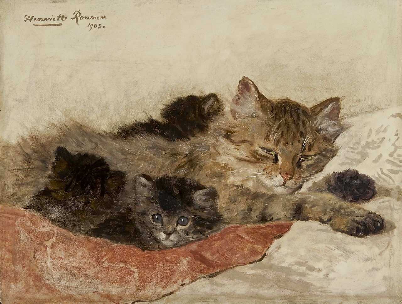 Henriette Ronner-Knip schilderde aanvankelijk dierstukken en honden, maar na 1870 specialiseerde ze zich in het schilderen van poezen. Feilloos wist ze de textuur van vachten, ogen en kleuren weer te geven en trof ze de soms rustige, soms speelse en onderzoekende aard van poezen. Haar werk was vooral geliefd bij de opkomende bourgeoisie in de 19e eeuw. Zij verbeeldt haar dieren dan ook al spelend, slapend en kruipend op en over de kostbare meubels en luxueuze stoffen die bij deze rijk geworden burgers zo in trek waren. Zowel in Nederland als in België werd zij vanwege haar werk geridderd.