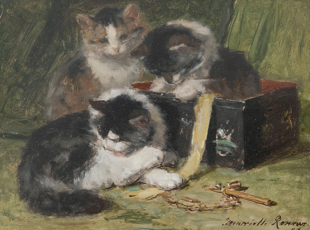 Henriette Ronner-Knip schilderde aanvankelijk dierstukken en honden, maar na 1870 specialiseerde ze zich in het schilderen van poezen. Feilloos wist ze de textuur van vachten, ogen en kleuren weer te geven en trof ze de soms rustige, soms speelse en onderzoekende aard van poezen. Haar werk was vooral geliefd bij de opkomende bourgeoisie in de 19e eeuw. Zij verbeeldt haar dieren dan ook al spelend, slapend en kruipend op en over de kostbare meubels en luxueuze stoffen die bij deze rijk geworden burgers zo in trek waren. Zowel in Nederland als in België werd zij vanwege haar werk geridderd.
