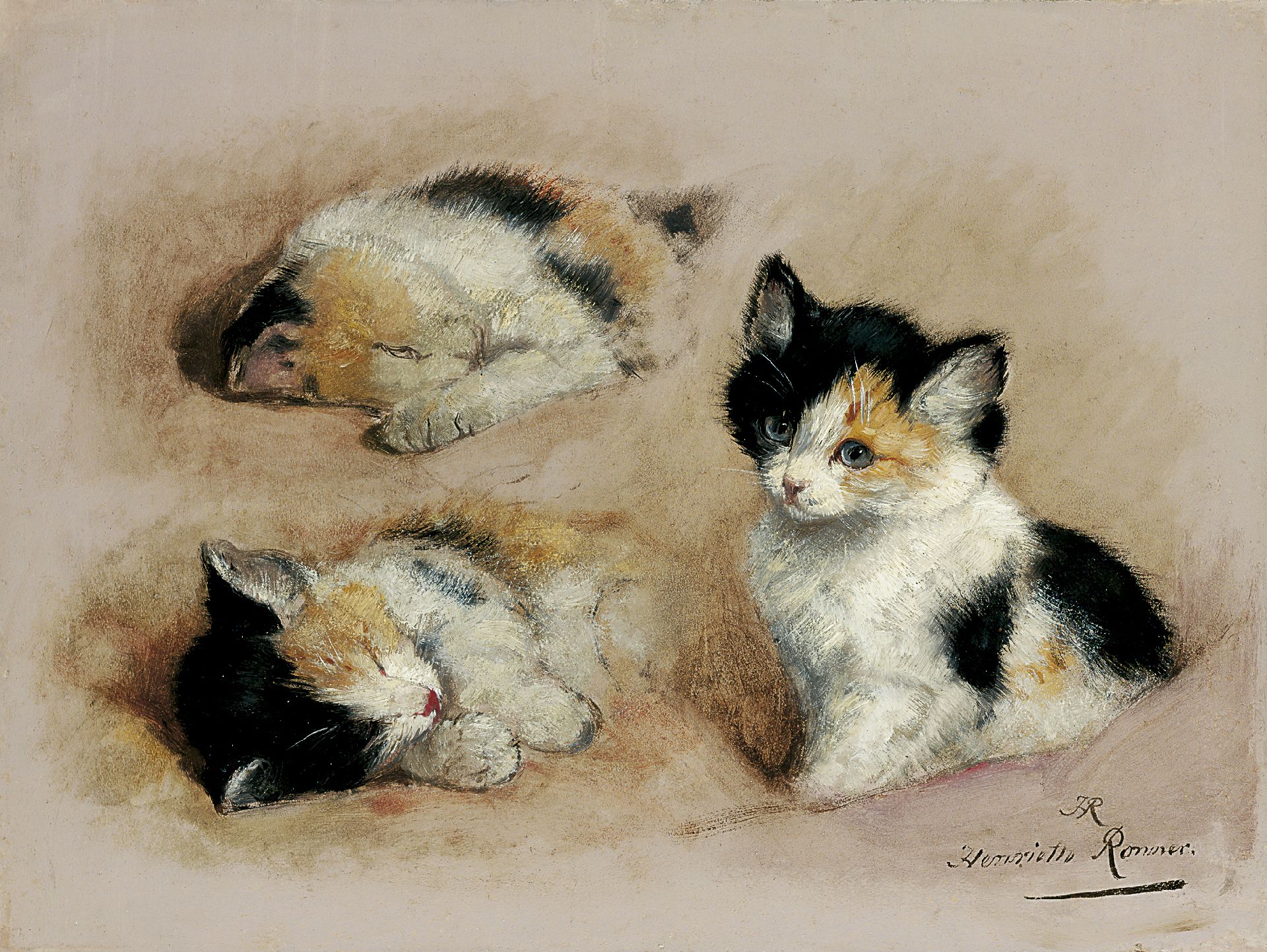 Henriette Ronner-Knip schilderde aanvankelijk dierstukken en honden, maar na 1870 specialiseerde ze zich in het schilderen van poezen. Feilloos wist ze de textuur van vachten, ogen en kleuren weer te geven en trof ze de soms rustige, soms speelse en onderzoekende aard van poezen. Haar werk was vooral geliefd bij de opkomende bourgeoisie in de 19e eeuw. Zij verbeeldt haar dieren dan ook al spelend, slapend en kruipend op en over de kostbare meubels en luxueuze stoffen die bij deze rijk geworden burgers zo in trek waren. Zowel in Nederland als in België werd zij vanwege haar werk geridderd.