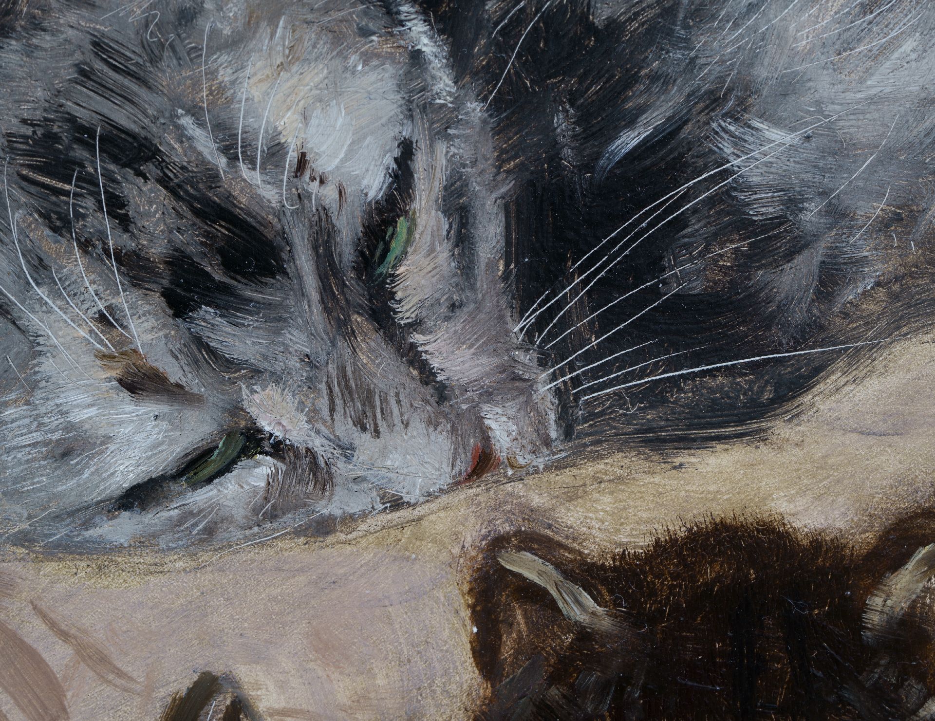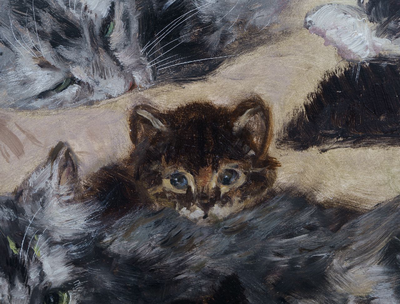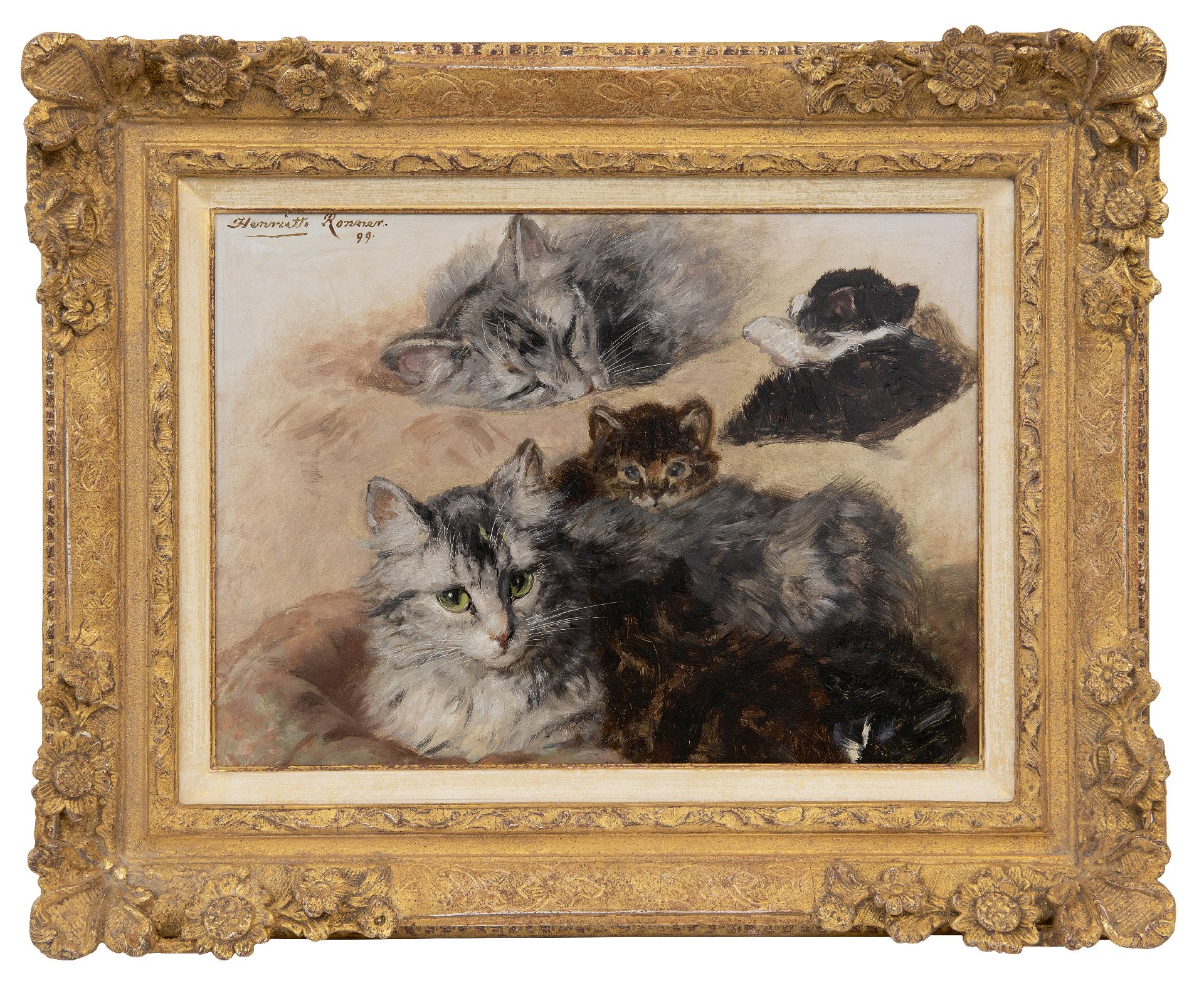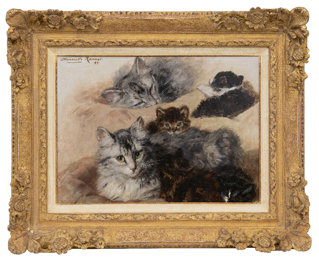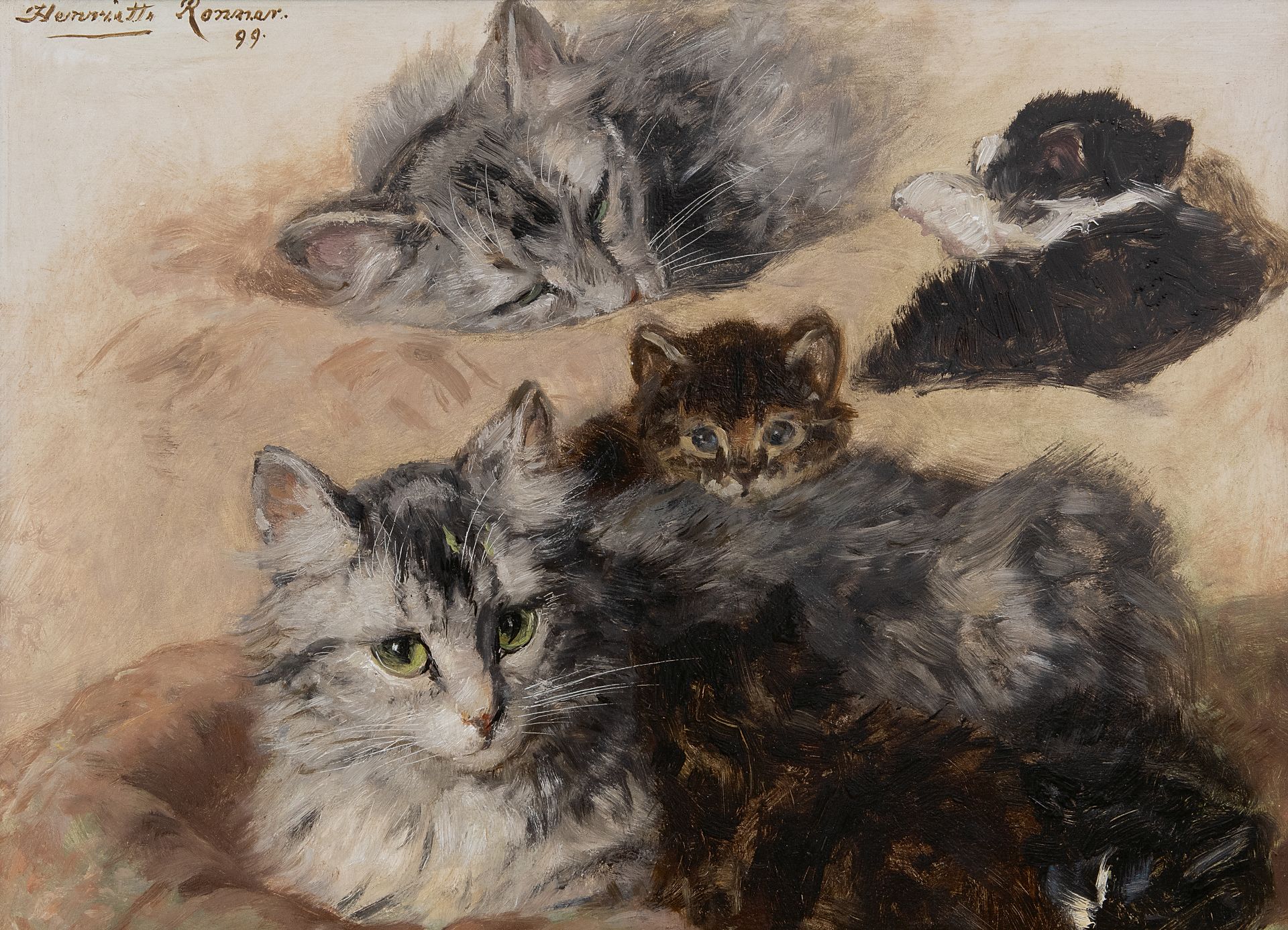 Henriette Ronner-Knip schilderde aanvankelijk dierstukken en honden, maar na 1870 specialiseerde ze zich in het schilderen van poezen. Feilloos wist ze de textuur van vachten, ogen en kleuren weer te geven en trof ze de soms rustige, soms speelse en onderzoekende aard van poezen. Haar werk was vooral geliefd bij de opkomende bourgeoisie in de 19e eeuw. Zij verbeeldt haar dieren dan ook al spelend, slapend en kruipend op en over de kostbare meubels en luxueuze stoffen die bij deze rijk geworden burgers zo in trek waren. Zowel in Nederland als in België werd zij vanwege haar werk geridderd.