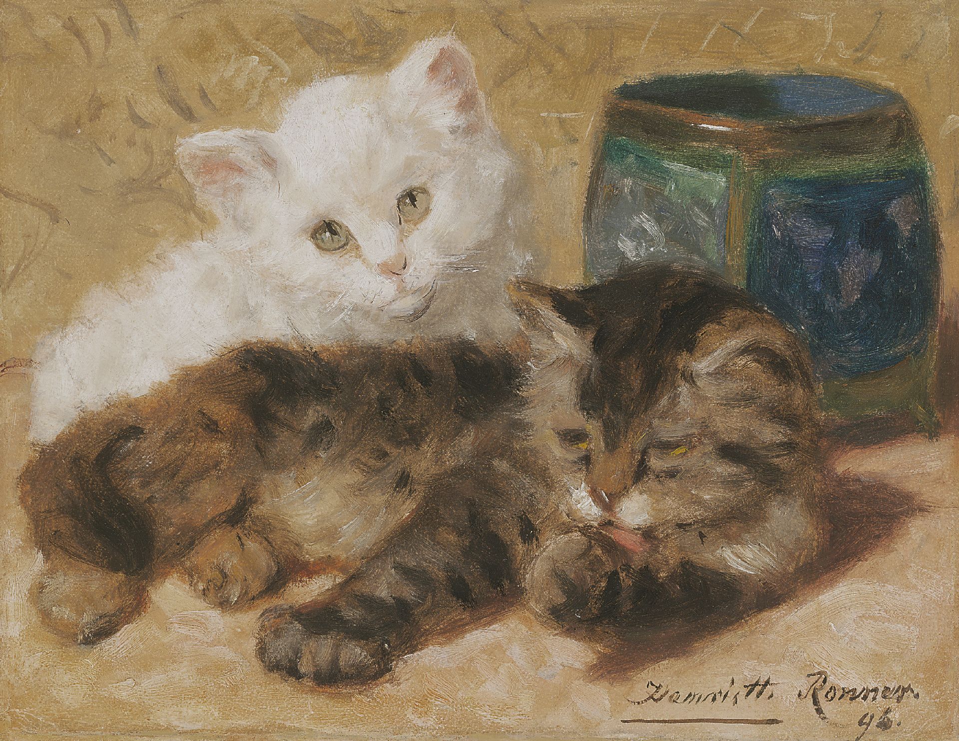 Henriette Ronner-Knip schilderde aanvankelijk dierstukken en honden, maar na 1870 specialiseerde ze zich in het schilderen van poezen. Feilloos wist ze de textuur van vachten, ogen en kleuren weer te geven en trof ze de soms rustige, soms speelse en onderzoekende aard van poezen. Haar werk was vooral geliefd bij de opkomende bourgeoisie in de 19e eeuw. Zij verbeeldt haar dieren dan ook al spelend, slapend en kruipend op en over de kostbare meubels en luxueuze stoffen die bij deze rijk geworden burgers zo in trek waren. Zowel in Nederland als in België werd zij vanwege haar werk geridderd.