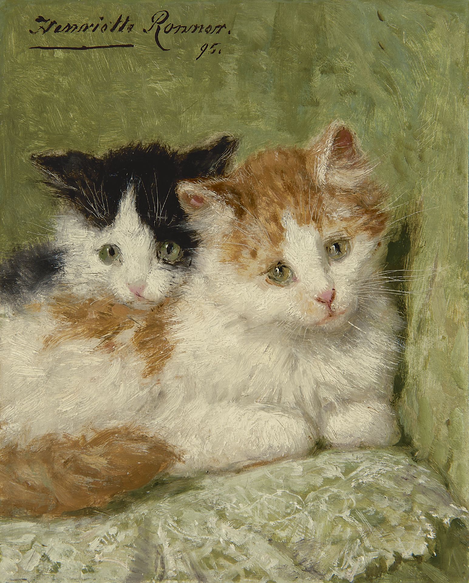 Henriette Ronner-Knip schilderde aanvankelijk dierstukken en honden, maar na 1870 specialiseerde ze zich in het schilderen van poezen. Feilloos wist ze de textuur van vachten, ogen en kleuren weer te geven en trof ze de soms rustige, soms speelse en onderzoekende aard van poezen. Haar werk was vooral geliefd bij de opkomende bourgeoisie in de 19e eeuw. Zij verbeeldt haar dieren dan ook al spelend, slapend en kruipend op en over de kostbare meubels en luxueuze stoffen die bij deze rijk geworden burgers zo in trek waren. Zowel in Nederland als in België werd zij vanwege haar werk geridderd.
