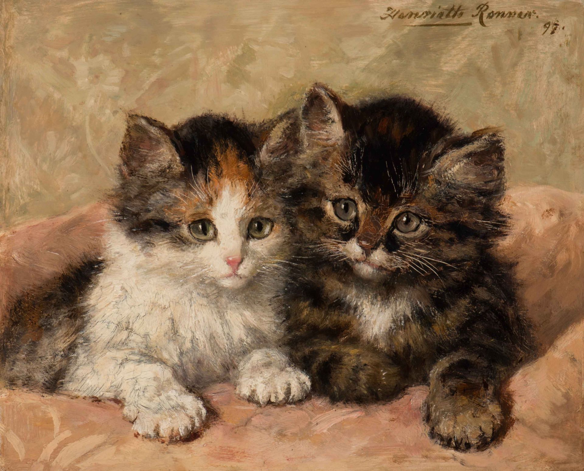 Henriette Ronner-Knip schilderde aanvankelijk dierstukken en honden, maar na 1870 specialiseerde ze zich in het schilderen van poezen. Feilloos wist ze de textuur van vachten, ogen en kleuren weer te geven en trof ze de soms rustige, soms speelse en onderzoekende aard van poezen. Haar werk was vooral geliefd bij de opkomende bourgeoisie in de 19e eeuw. Zij verbeeldt haar dieren dan ook al spelend, slapend en kruipend op en over de kostbare meubels en luxueuze stoffen die bij deze rijk geworden burgers zo in trek waren. Zowel in Nederland als in België werd zij vanwege haar werk geridderd.