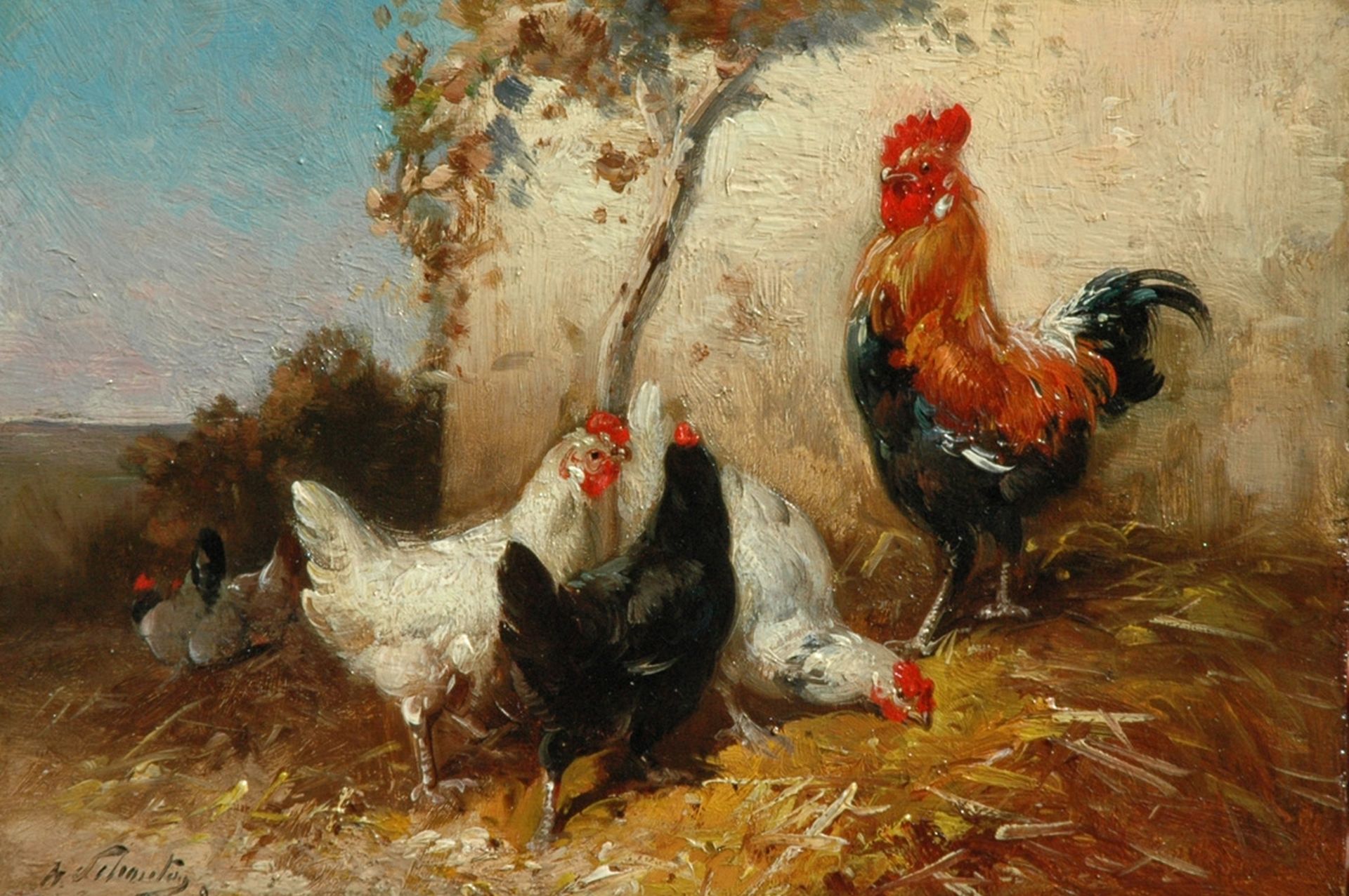 Henry Schouten kunstwerk • schilderij • voorheen te koop Scharrelende haan en hennen