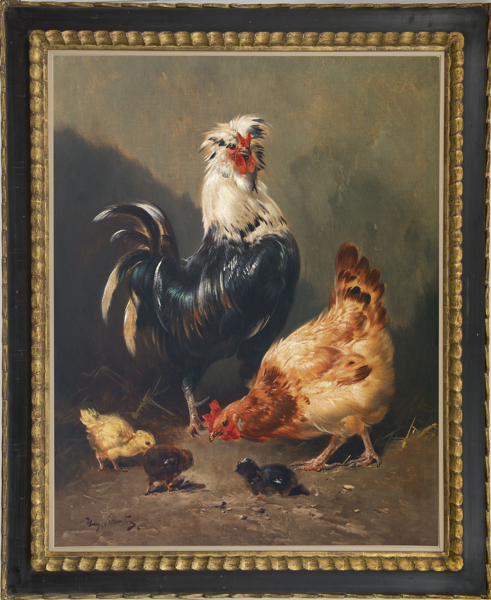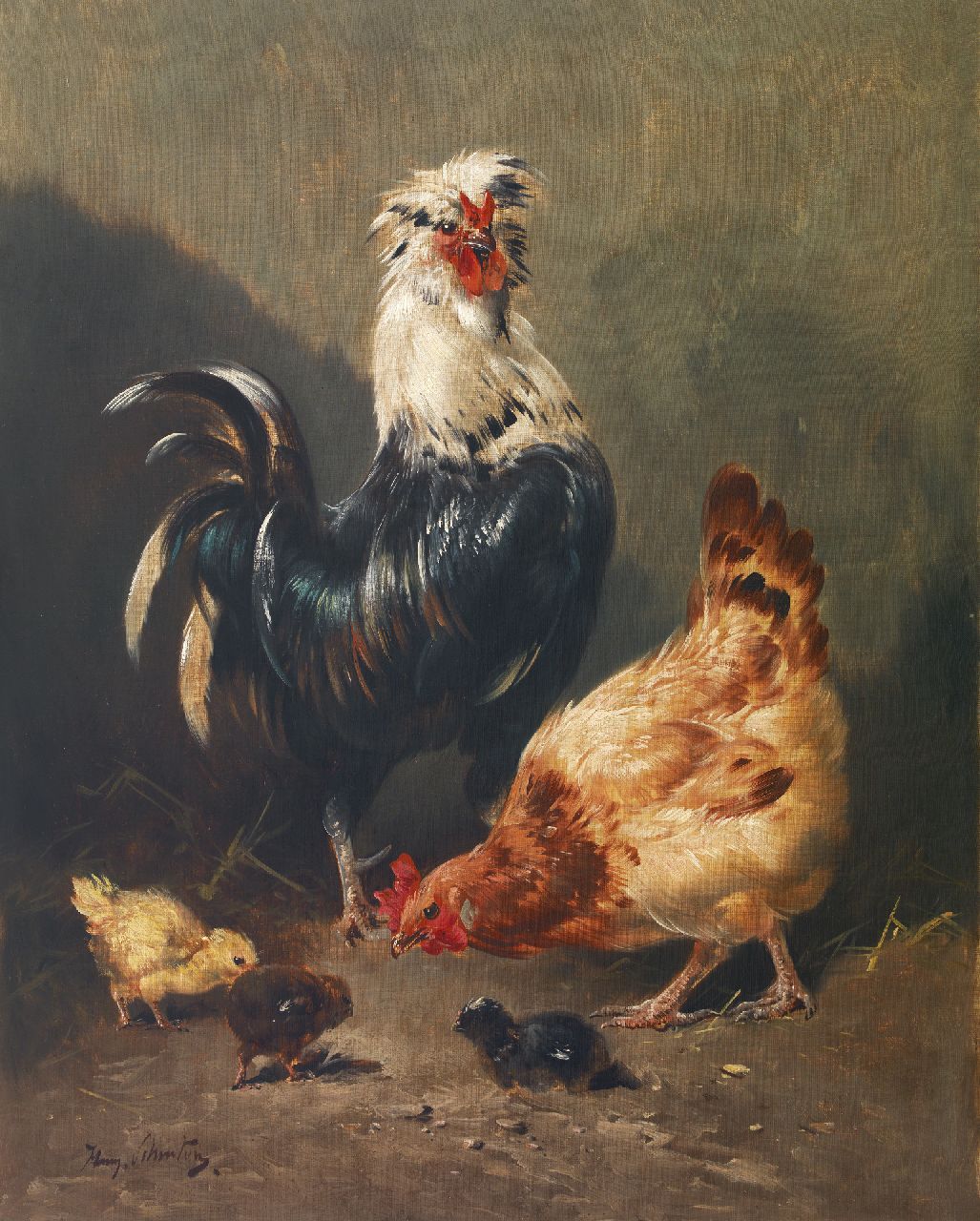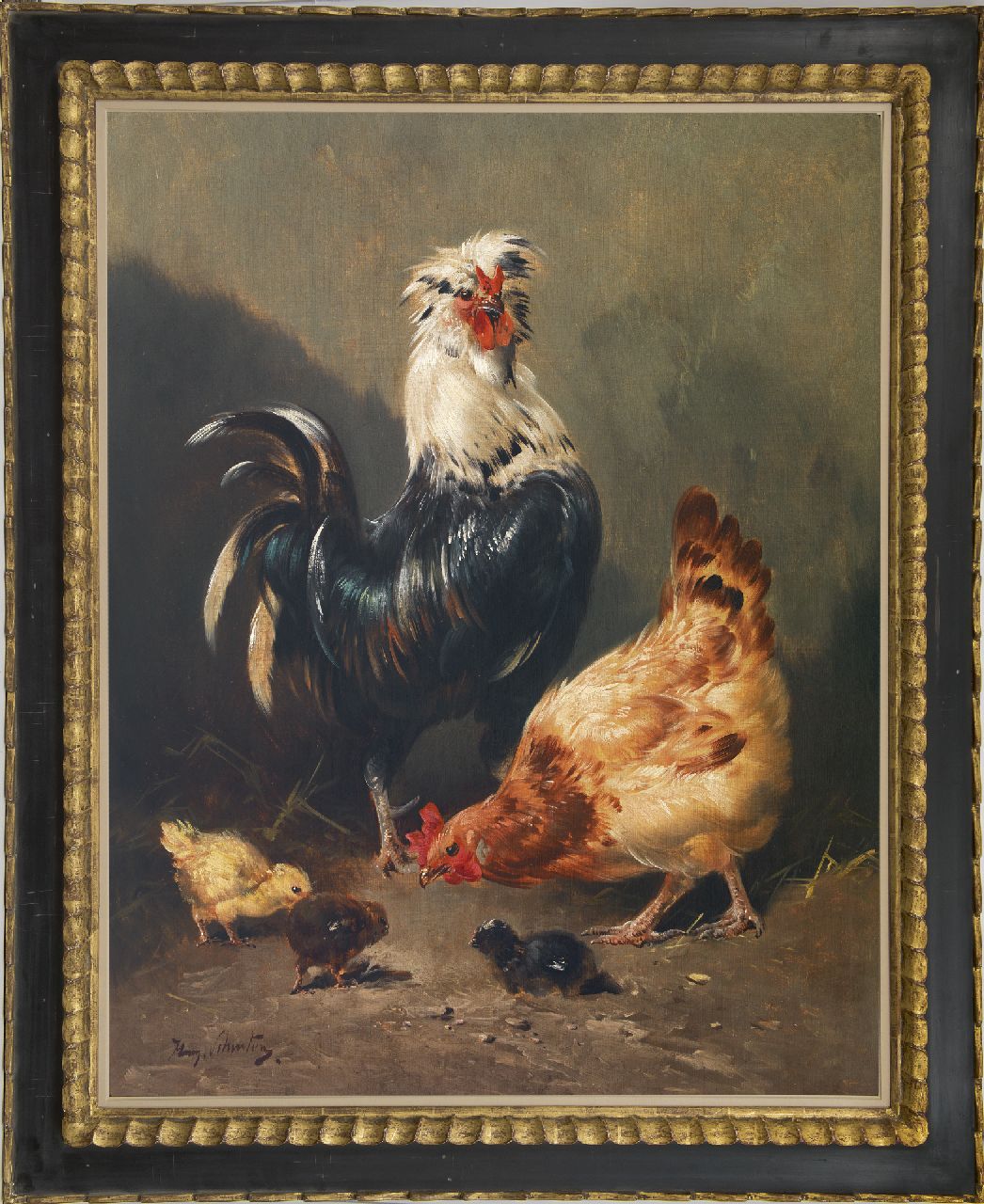 De Belgische schilder Henry Schouten leerde op de academie van Brussel en vooral onder invloed van zijn leermeester Alfred Verwee het schilderen van dieren en landschappen met vee. Hij zou er beroemd mee worden. Naast koeien en paarden voegde hij geleidelijk aan ook honden en pluimvee toe aan zijn repertoire. Naar de mode van zijn tijd beeldde hij deze dieren af in hun natuurlijke omgeving, met aandacht voor de speciale karaktereigenschappen van hun ras. De schilderijen van Schouten waren in de tweede helft van de 19e eeuw zeer geliefd bij de rijke Belgische bourgeoisie.