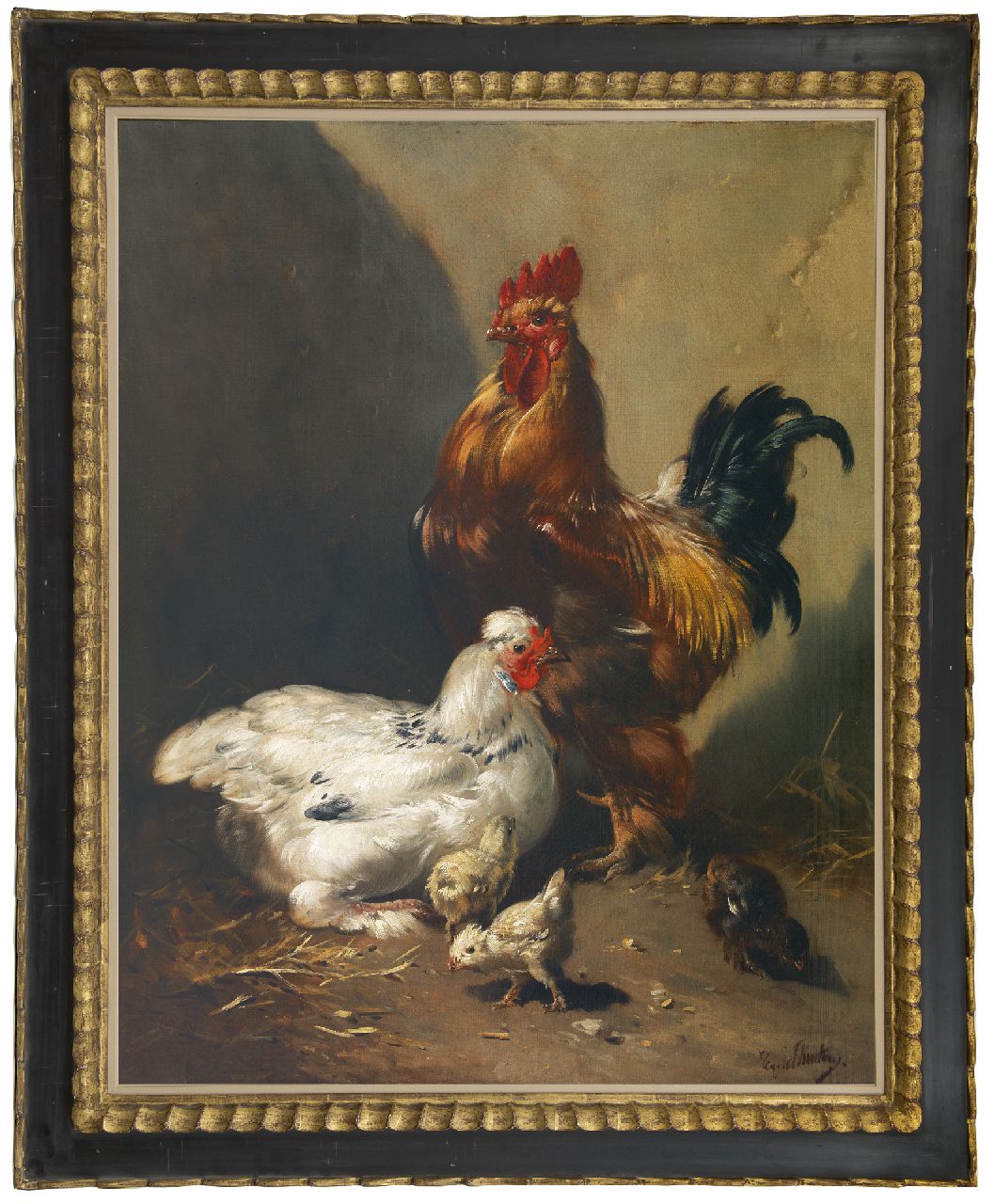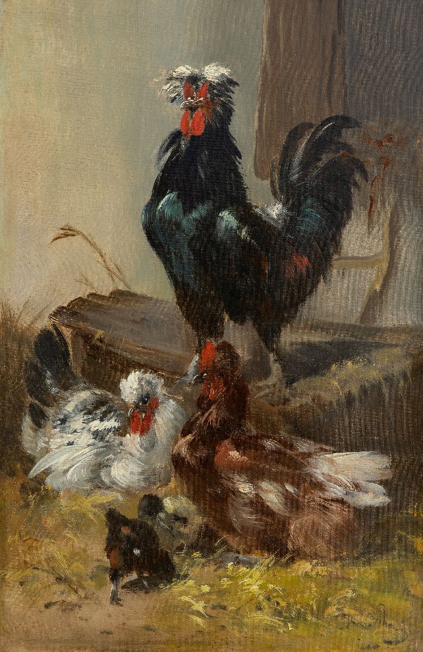 De Belgische schilder Henry Schouten leerde op de academie van Brussel en vooral onder invloed van zijn leermeester Alfred Verwee het schilderen van dieren en landschappen met vee. Hij zou er beroemd mee worden. Naast koeien en paarden voegde hij geleidelijk aan ook honden en pluimvee toe aan zijn repertoire. Naar de mode van zijn tijd beeldde hij deze dieren af in hun natuurlijke omgeving, met aandacht voor de speciale karaktereigenschappen van hun ras. De schilderijen van Schouten waren in de tweede helft van de 19e eeuw zeer geliefd bij de rijke Belgische bourgeoisie.