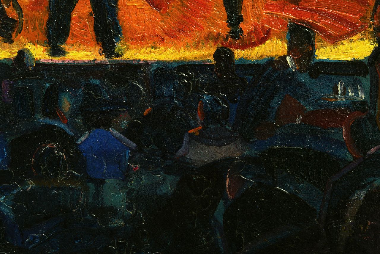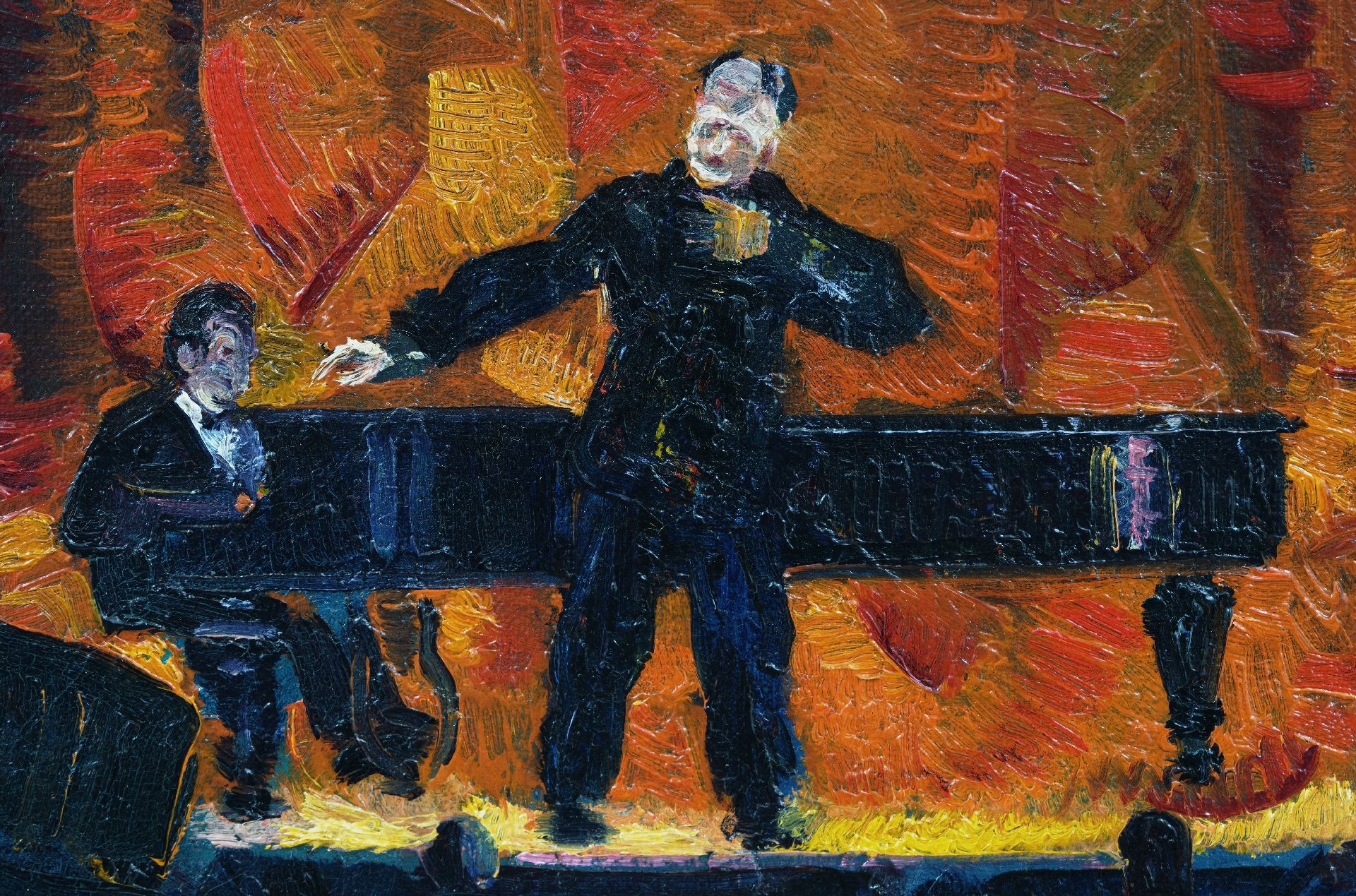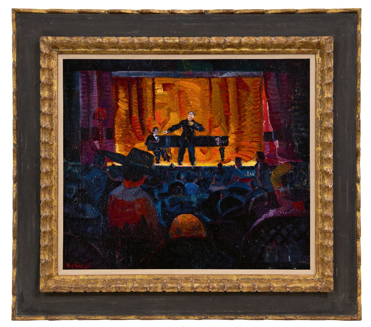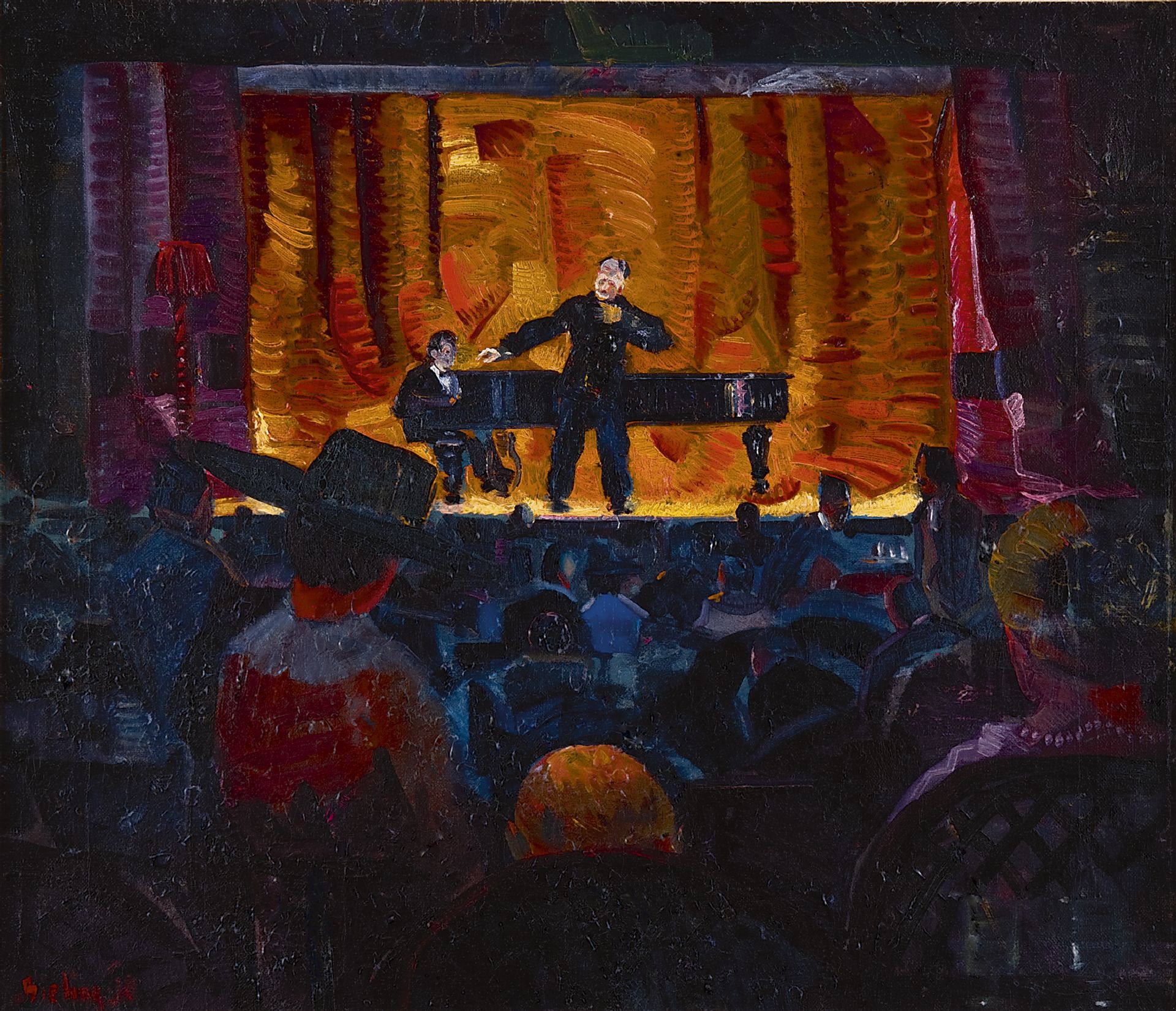 Jean-Louis Pisuisse (1880-1927) trad vanaf 1912 op met zijn Cabaret Artistique. De schilder Herman Bieling legt hem hier vast tijdens een van zijn optredens en gebruikt daarvoor een standpunt achter in de zaal. Zeker de helft van het doek wordt ingenomen door de toeschouwers, die op de amfitheatersgewijs geplaatste stoelen zitten en donker afsteken tegen het verlichte toneel. Bieling bereikt hiermee een atmosfeer van gespannen toekijken, een middel dat bijvoorbeeld Isaac Israëls voor hem ook gebruikte. Pisuisse was een van de eerste cabaretiers van Nederland. Als journalist reisde hij al jong naar Parijs, waar hij onder de indruk raakt van het cabaret artistique ‘Le Chat Noir’ met als de grote ster Aristide Bruant en tal van andere beroemdheden. Terug in Nederland richt hij een volwaardig cabaretgezelschap op en organiseert vanaf 1912 voorstellingen in het Kurhaus in Scheveningen. Zelf zingt hij met krachtige zangstem liederen en houdt conferences. Met zijn eruditie, internationale gerichtheid en zijn leiderschap had Pisuisse grote invloed op de ontwikkeling en latere bloei van het Nederlandse cabaret. In 1927 werden hij en zijn vrouw, de zangeres Jenny Gilliams, op het Rembrandtplein door haar jaloerse minnaar doodgeschoten.
