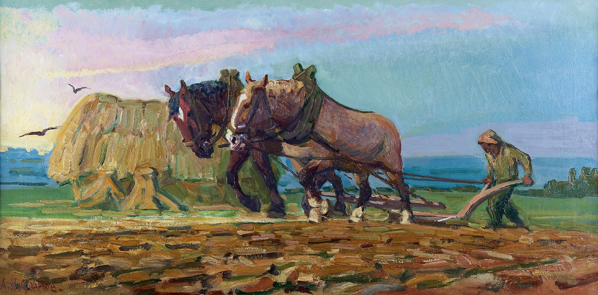 Gouwe A.H.  | Adriaan Herman Gouwe, Ploegende boer, olieverf op doek 43,3 x 85,5 cm, gesigneerd linksonder