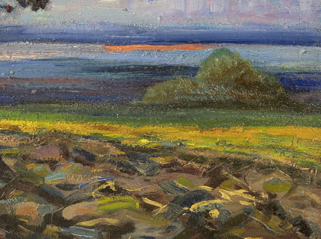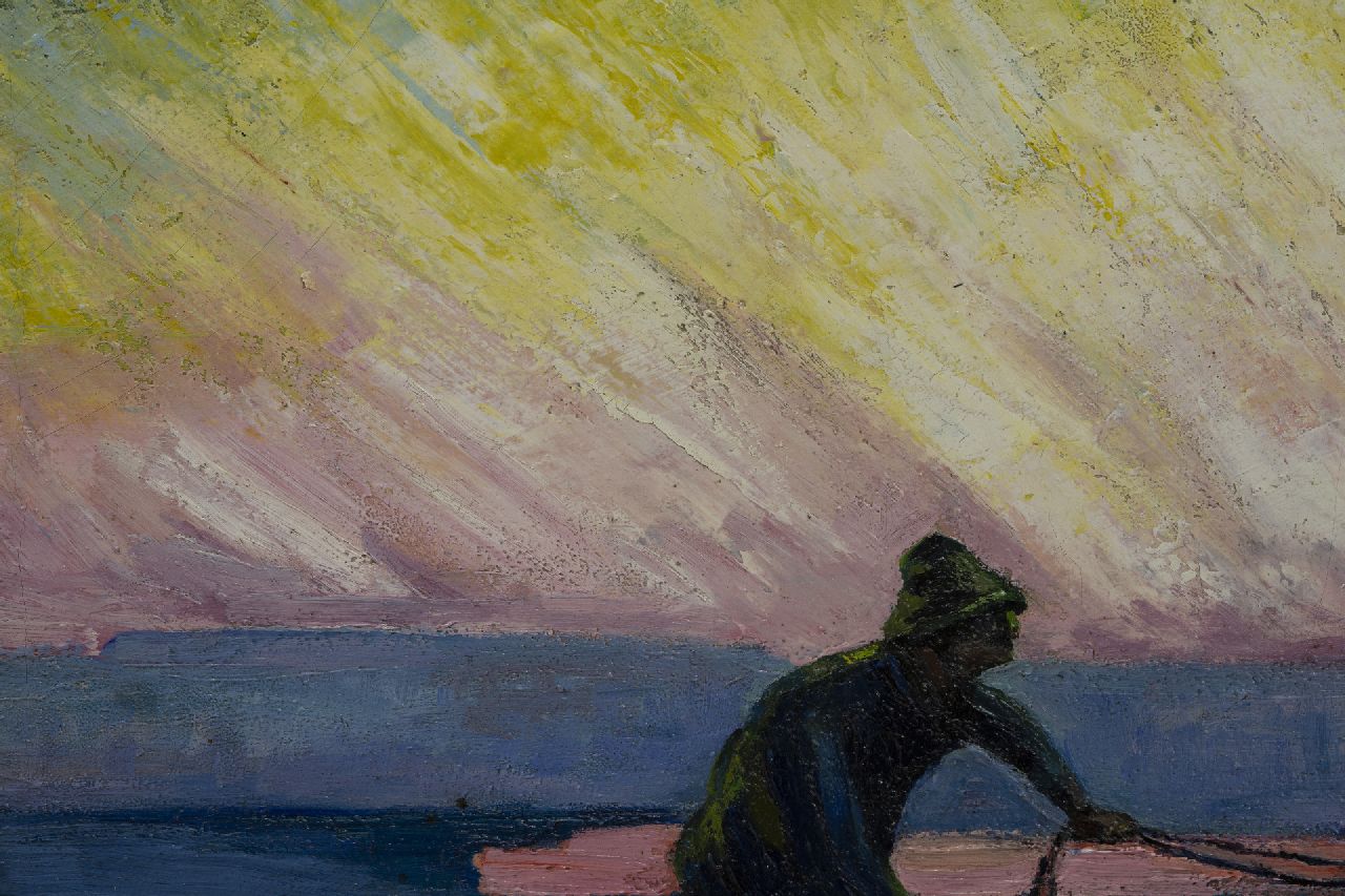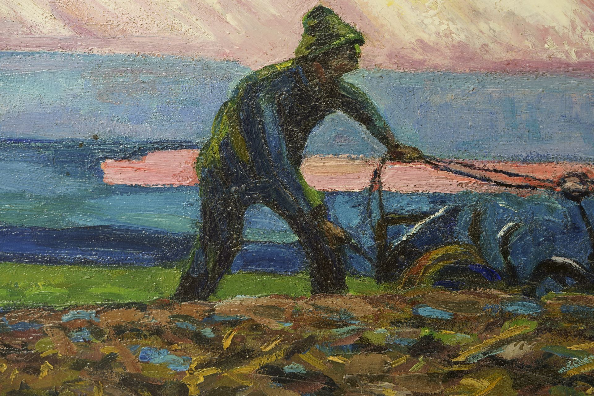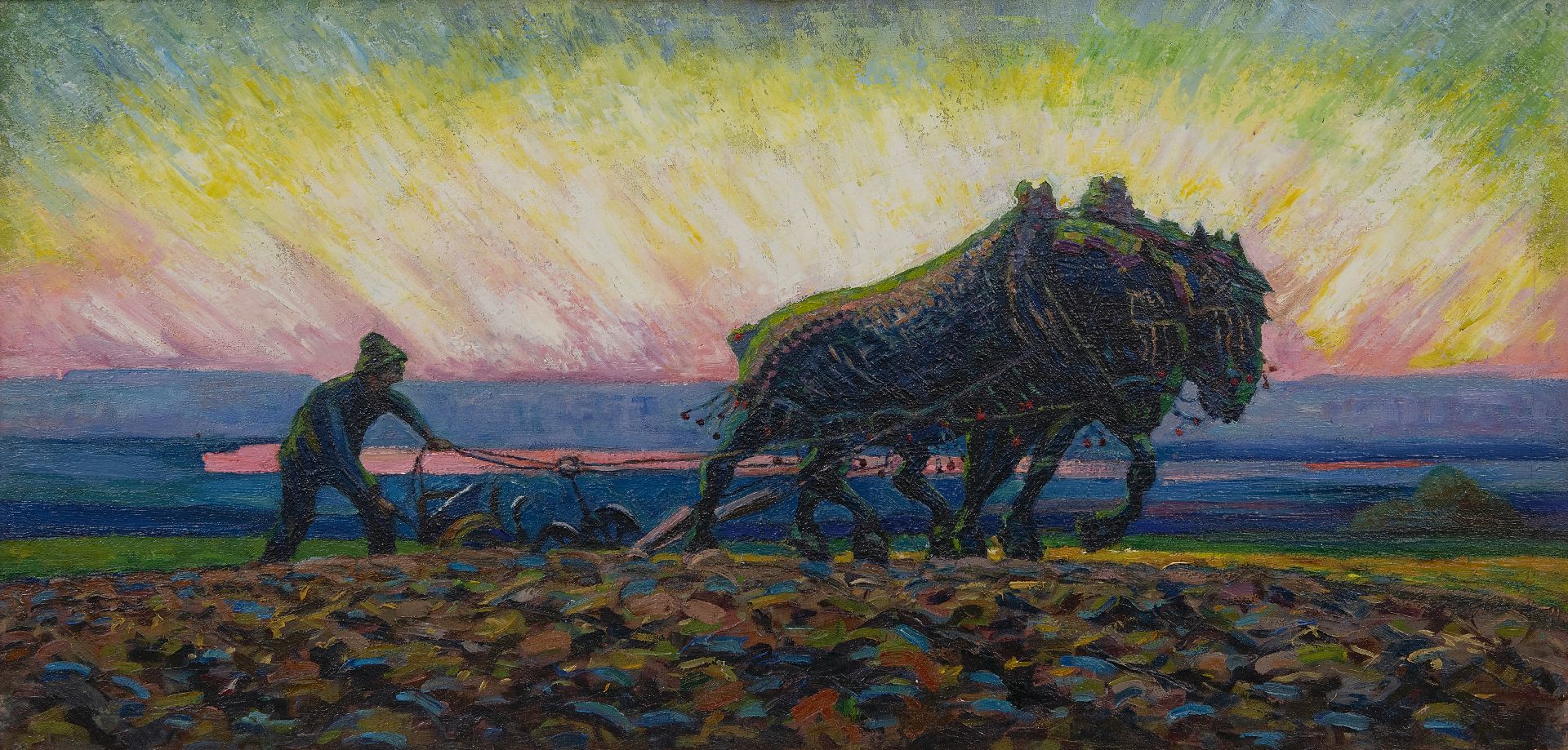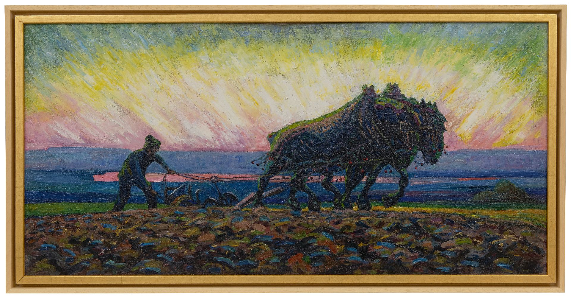 Herman Gouwe behoort tot de Hollandse luministen. Hij studeerde aan de Amsterdamse Rijksakademie en reisde daarna twee jaar rond in Italië en Spanje. Na zijn terugkeer in 1905 woonde hij tot 1910 in Maastricht en keerde daarna elke zomer terug om het Limburgse landschap en akkers met boeren en paarden te schilderen. Nadat hij rond 1910 in Blaricum kennis maakte met het luminisme van Jan Sluijters, Leo Gestel en Ferdinand Hart Nibbrig, werden zijn schilderijen puur zonlicht en kleur. Een voorbeeld hiervan is dit schilderij. Paarden, ploeg en boer bewegen zich door het veld. In de verte doemen vanuit een paarse ochtendnevel de gouden stralen op van een zich aankondigende zon. De ruggen van de paarden vangen al het eerste zonlicht. In dit spel van kleuren, licht en tegenlicht vormen ze een krachtig symbool van het bewerken van de aarde, zoals boeren dat al eeuwenlang doen.