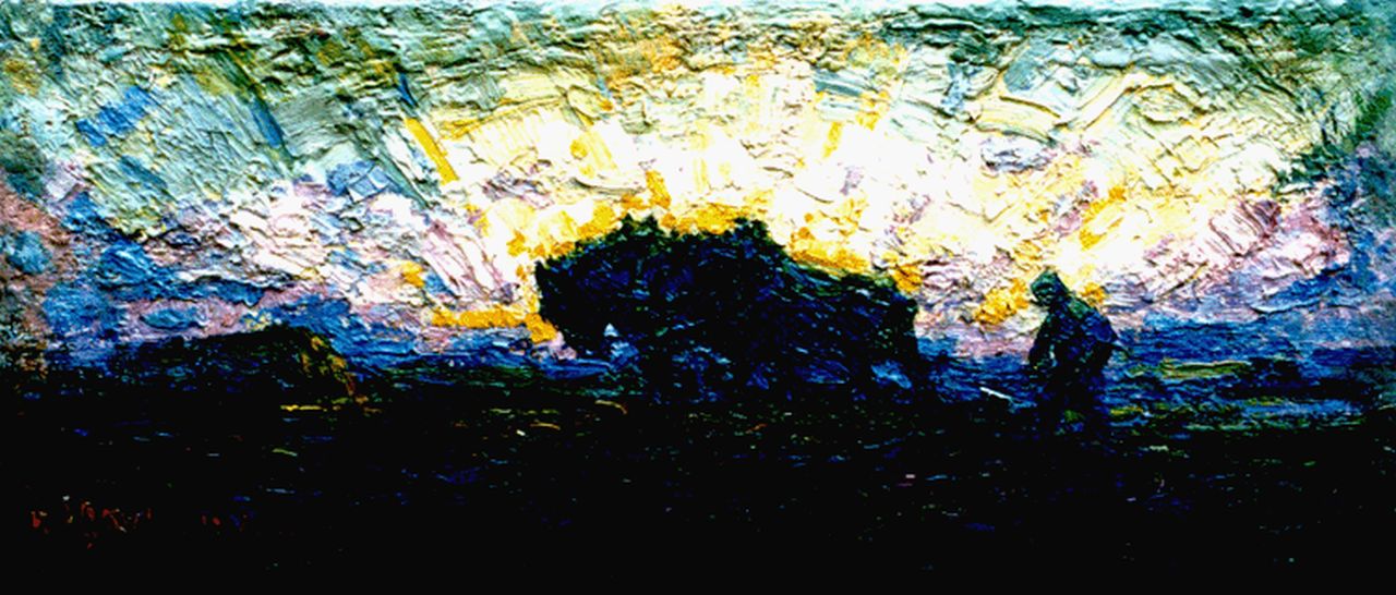 Herman Gouwe kunstwerk • schilderij • voorheen te koop Ploeger bij zonsondergang