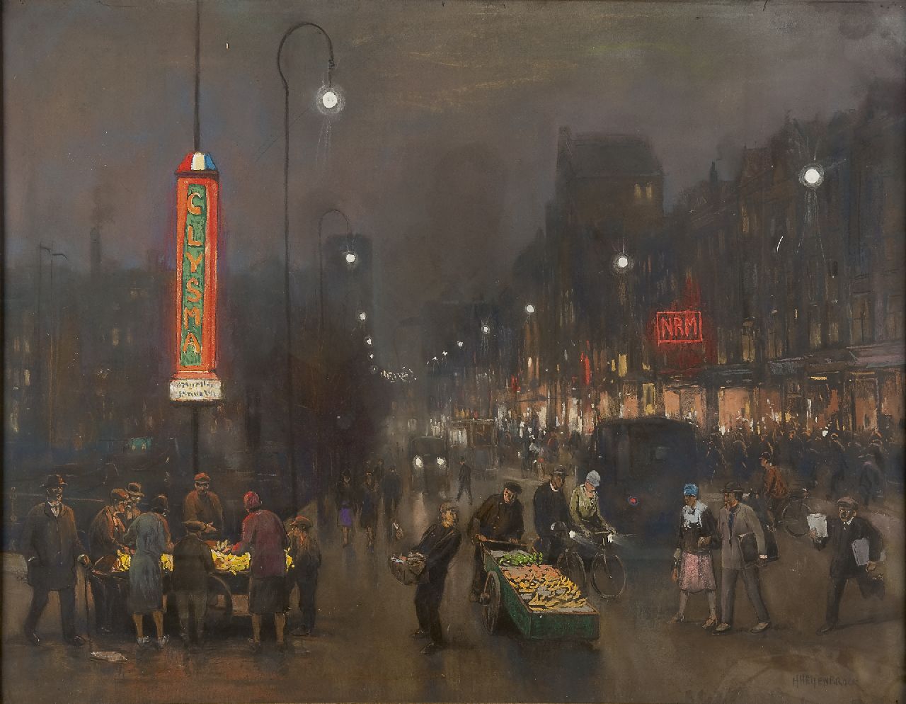 Herman Heijenbrock kunstwerk • aquarel • tekening • voorheen te koop Avond op het Damrak te Amsterdam