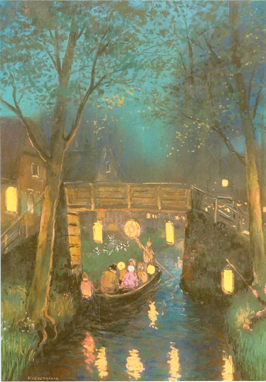 Herman Heijenbrock kunstwerk • aquarel • tekening • voorheen te koop Lampionnentocht in Giethoorn