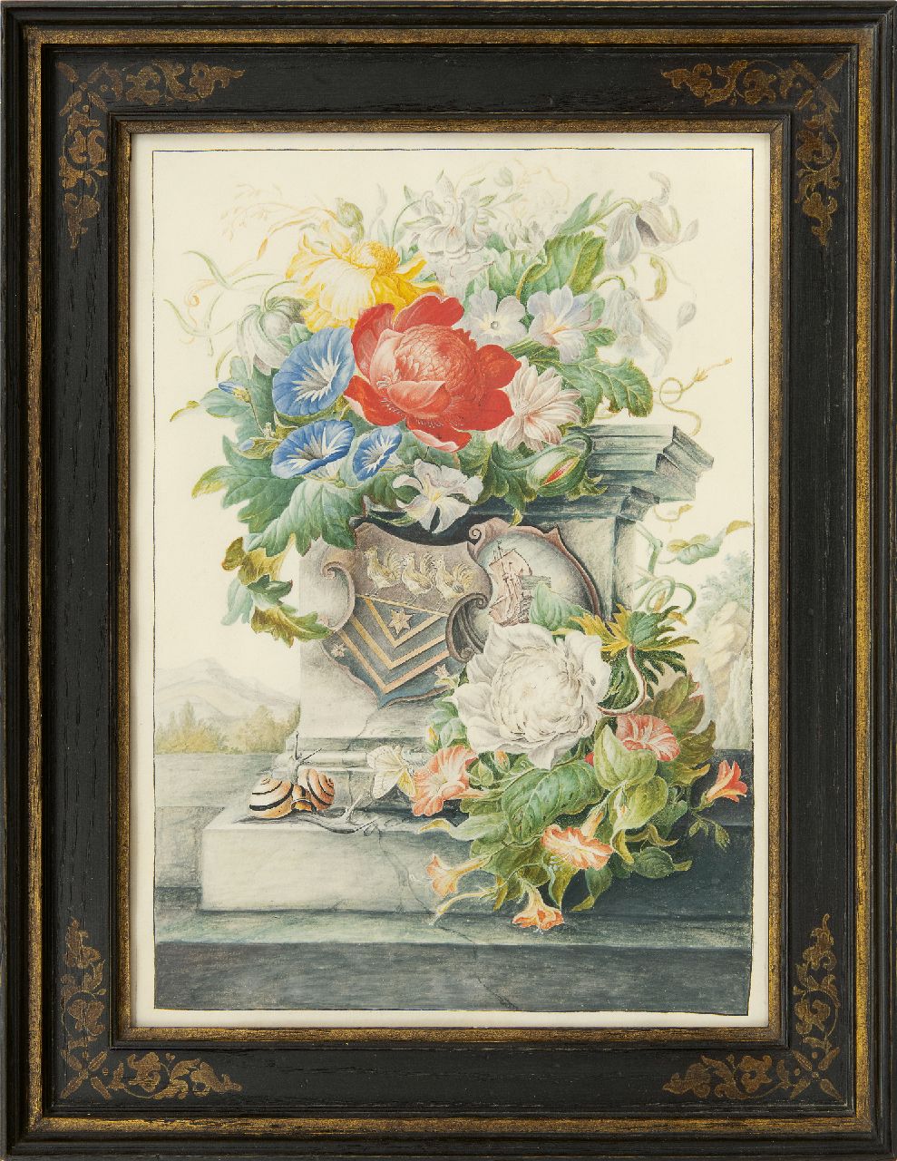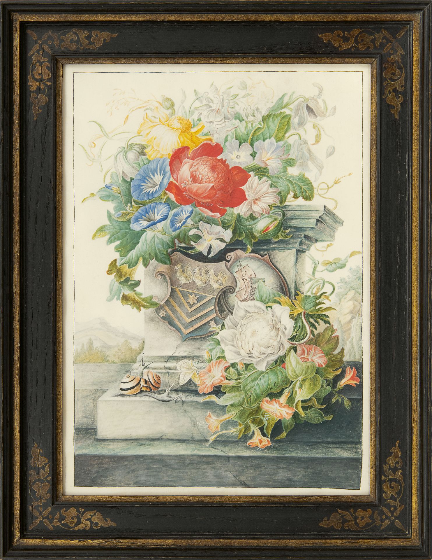 Herman Henstenburgh kunstwerk • aquarel • tekening • te koop Bloemstilleven met stenen zuil en wapenschilden