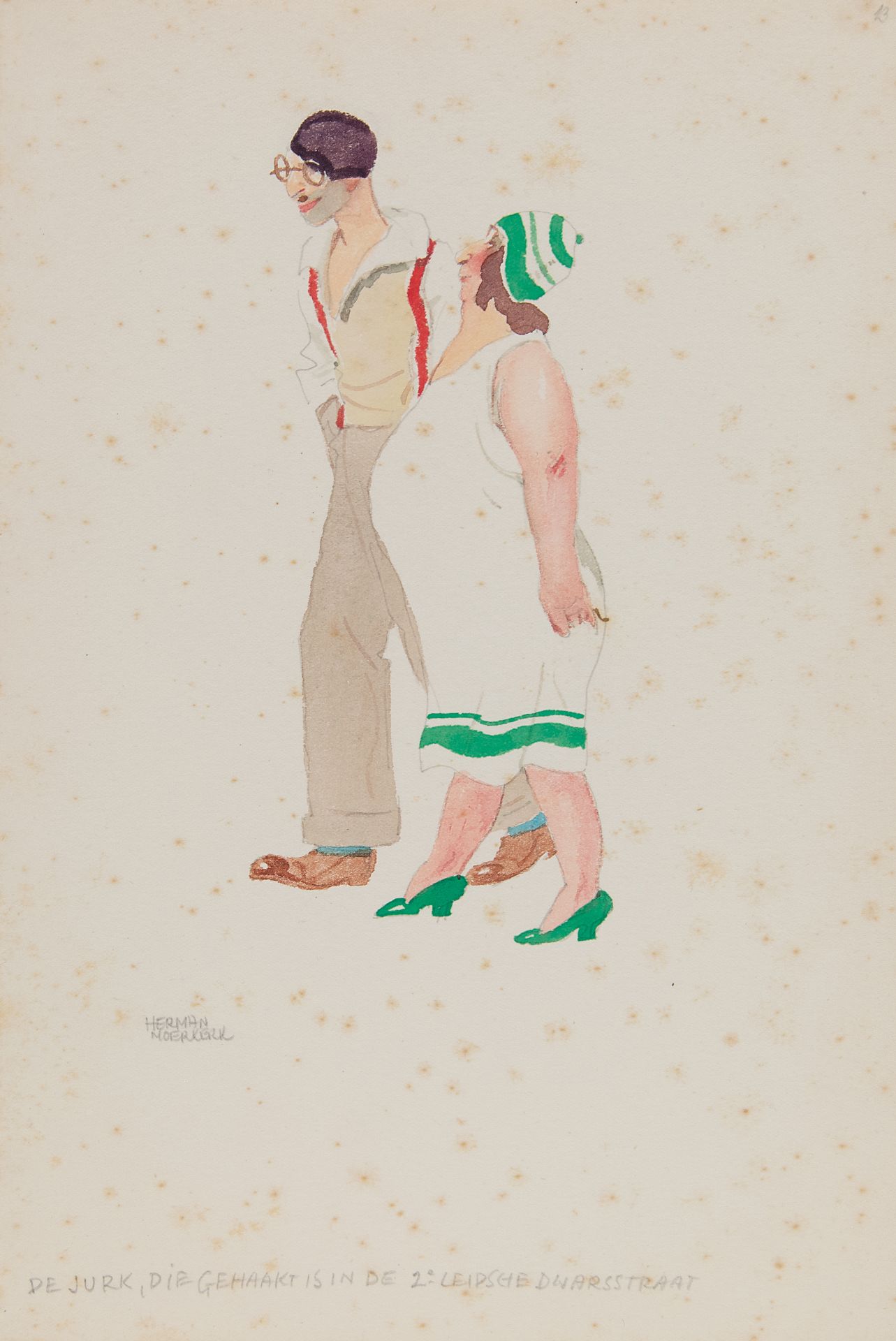 Herman Moerkerk kunstwerk • aquarel • tekening • te koop Amsterdammers flanerend in Zandvoort: de jurk, die gehaakt is in de 2e Leidsche Dwarsstraat