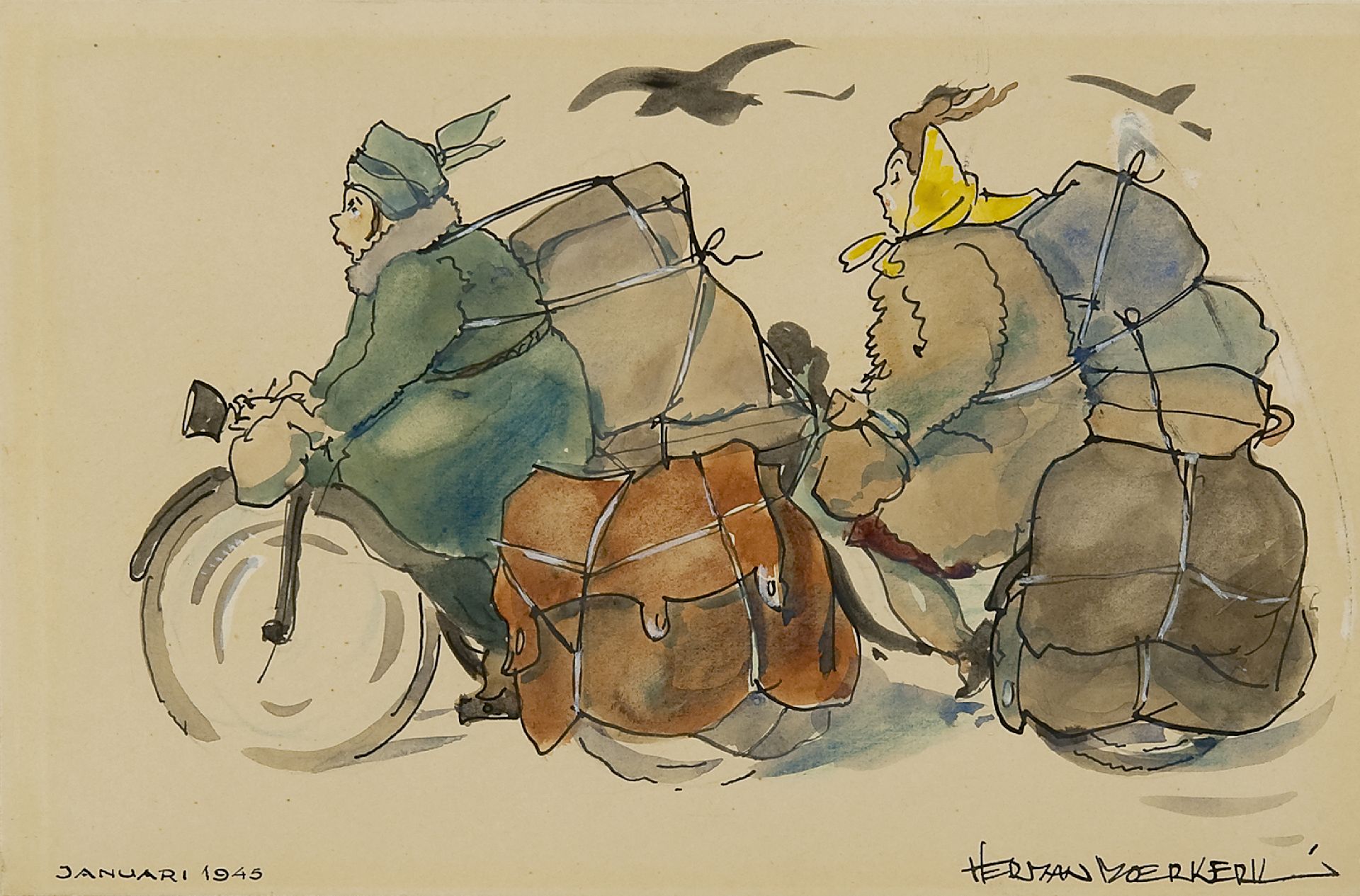 Moerkerk H.A.J.M.  | Hermanus Antonius Josephus Maria 'Herman' Moerkerk, Bepakt en bezakt in de hongerwinter, aquarel op papier 13,8 x 20,9 cm, gesigneerd rechtsonder en gedateerd januari 1945