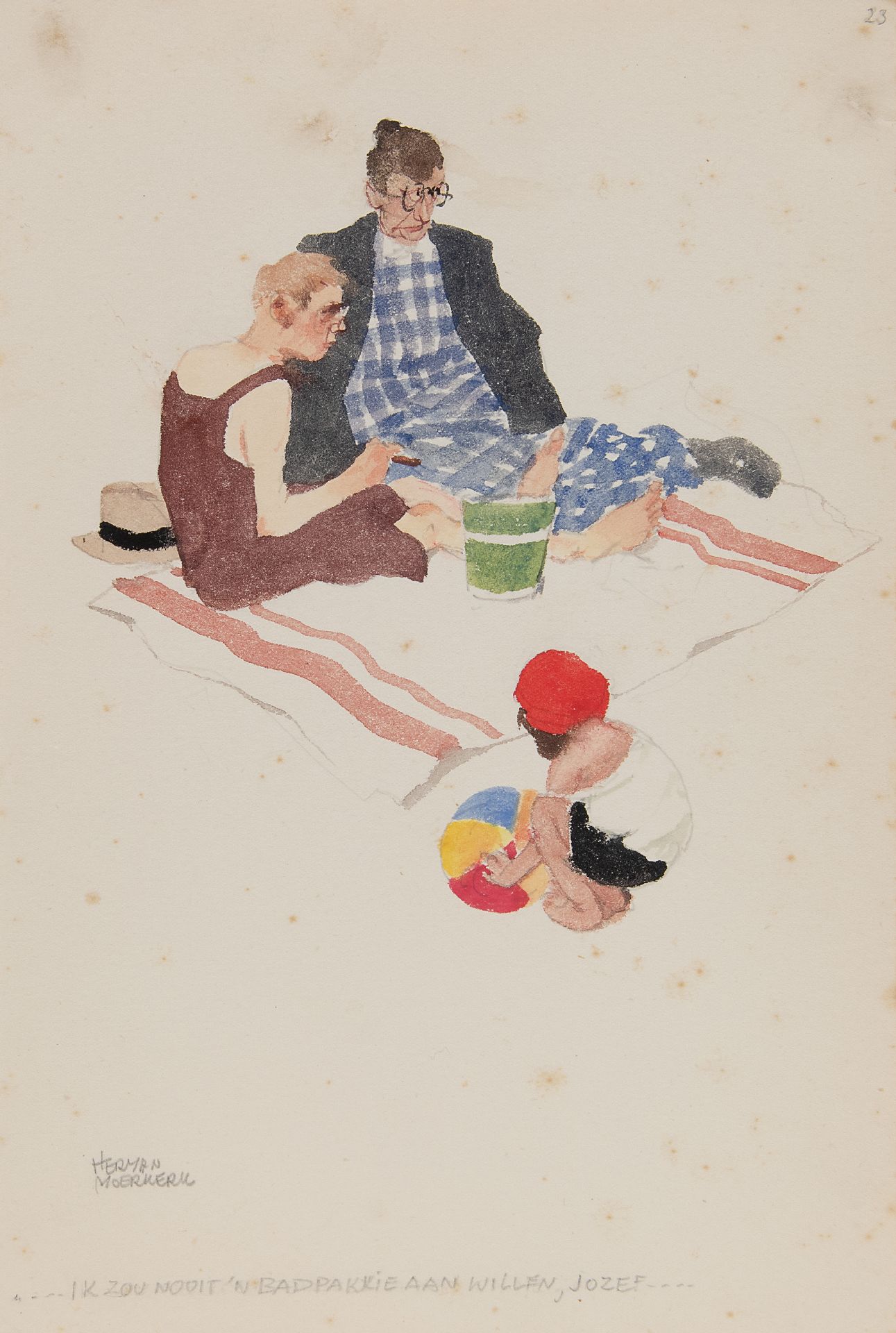 Herman Moerkerk kunstwerk • aquarel • tekening • te koop '...Ik zou nooit 'n badpakkie aan willen, Jozef....'