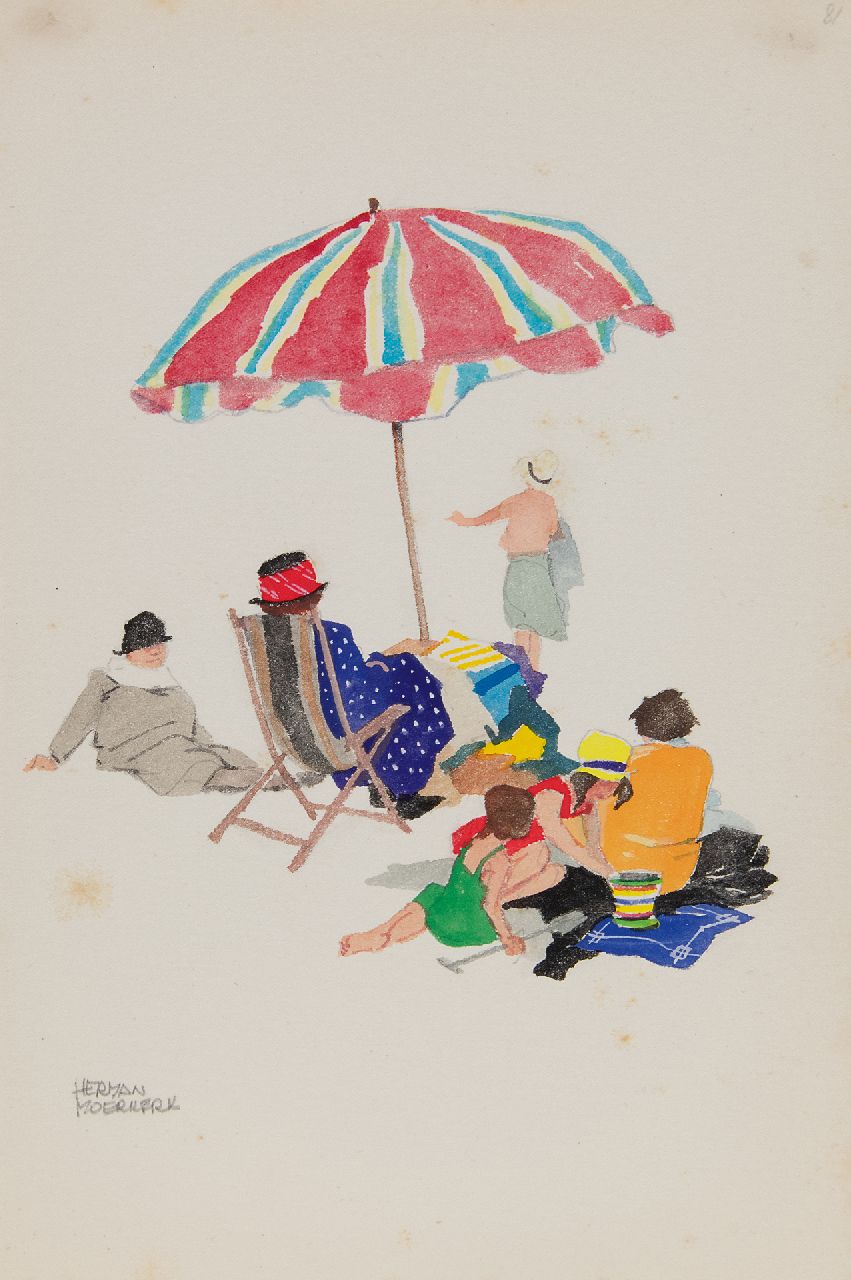 Herman Moerkerk kunstwerk • aquarel • tekening • voorheen te koop Onder moeders parasol op Zandvoort