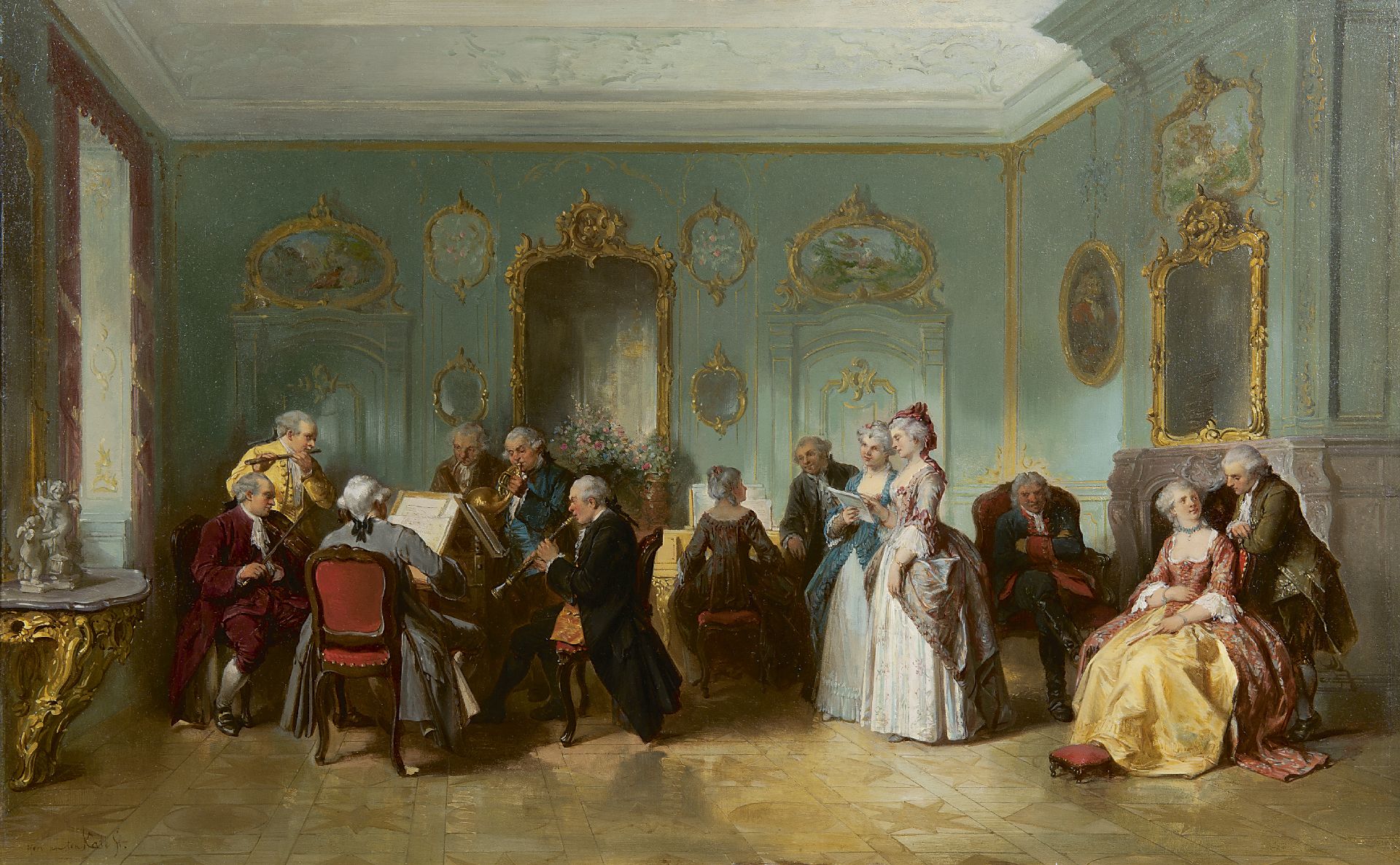De romantische schilder Herman ten Kate plaatst zijn genrevoorstellingen graag in een historische omgeving. De 17e eeuw is daarbij favoriet, maar ook een rococo setting bood hem de gelegenheid om zijn kennis en virtuoze penseel te tonen. Als hij rond 1855 'De Muziekavond' schildert zijn salonavonden met een huisconcertachtige opzet al enkele tientallen jaren in zwang. Het was Franz Schubert die dit soort samenkomsten voor het eerst aan het begin van de 19e eeuw organiseerde. Tijdens deze ‘Schubertiades’ werd muziek gemaakt, voorgelezen en soms gedanst en gefeest. Veel van Schuberts werk werd op zo’n avond voor de eerste maal ten gehore gebracht.