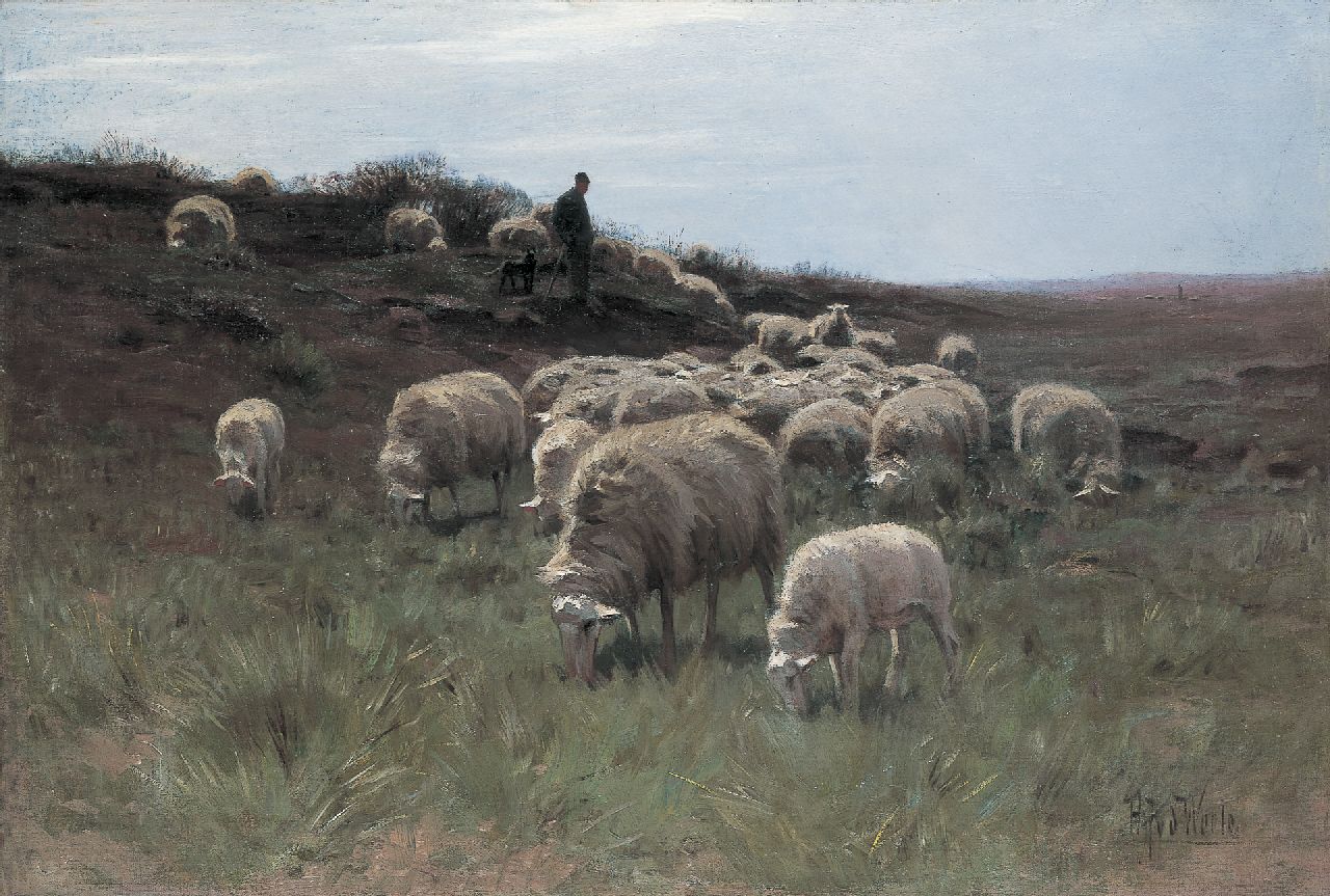 Herman van der Weele kunstwerk • schilderij • voorheen te koop Herder met schaapskudde op de hei