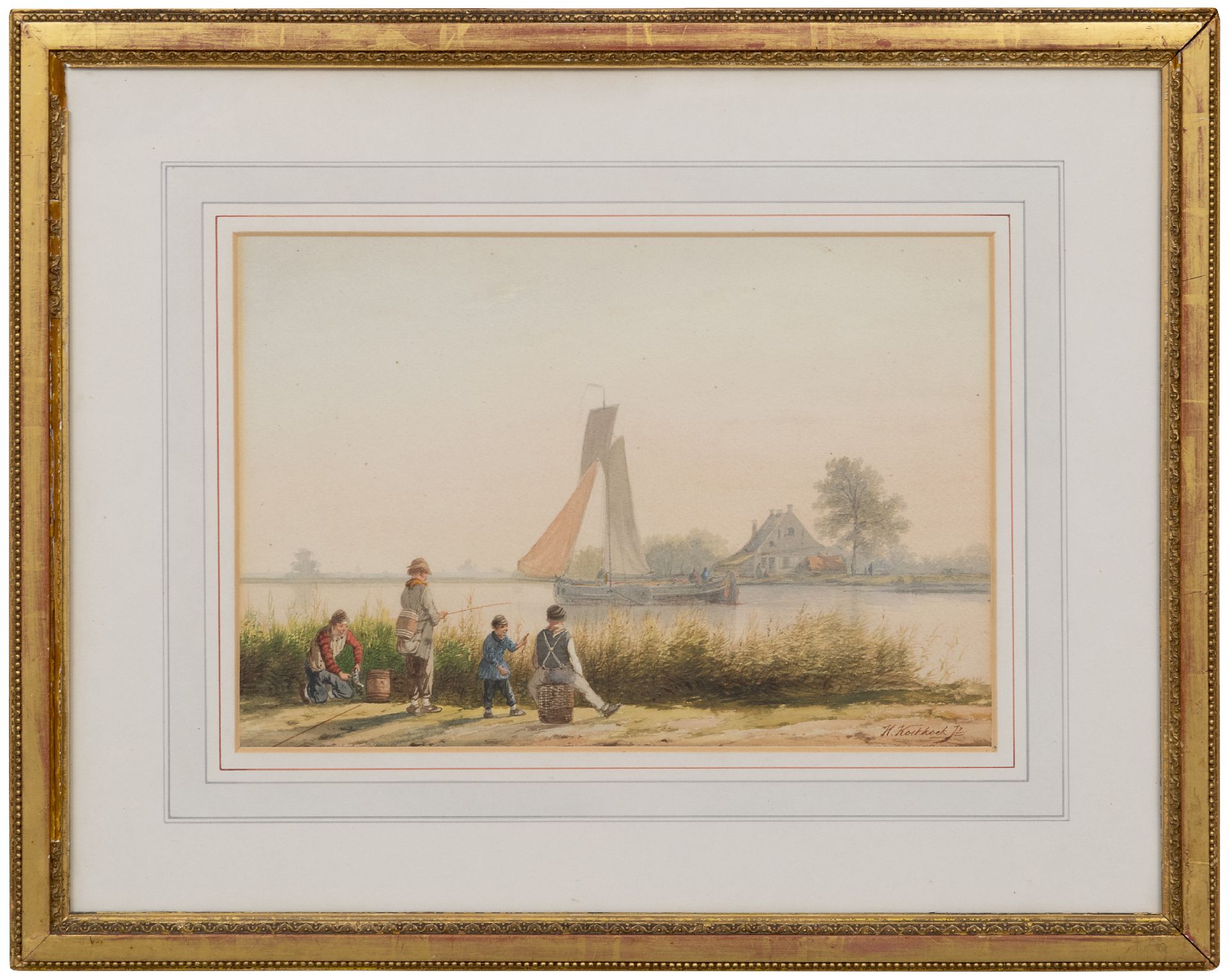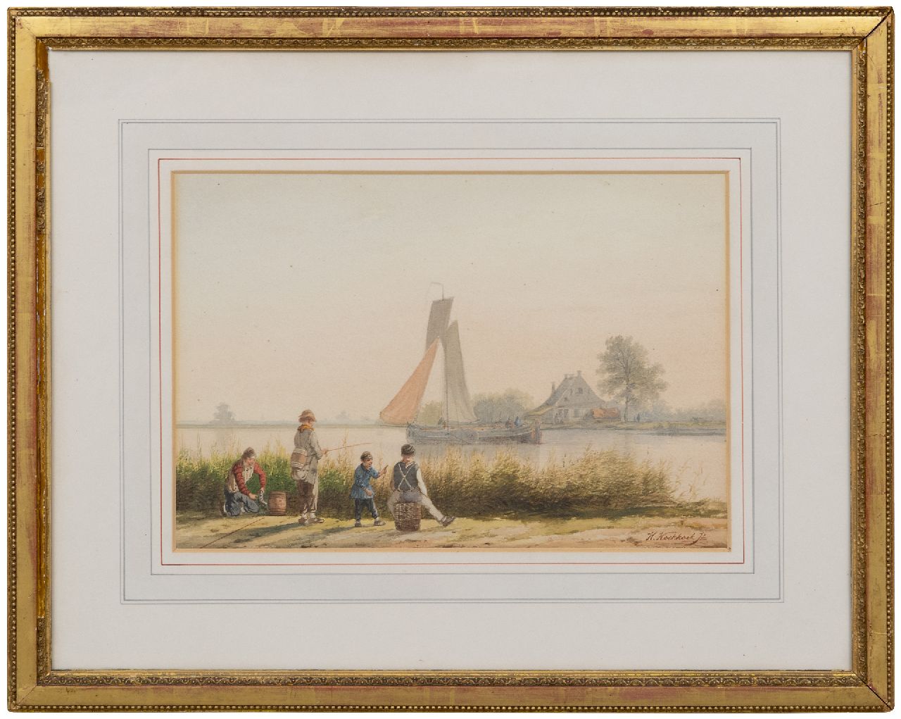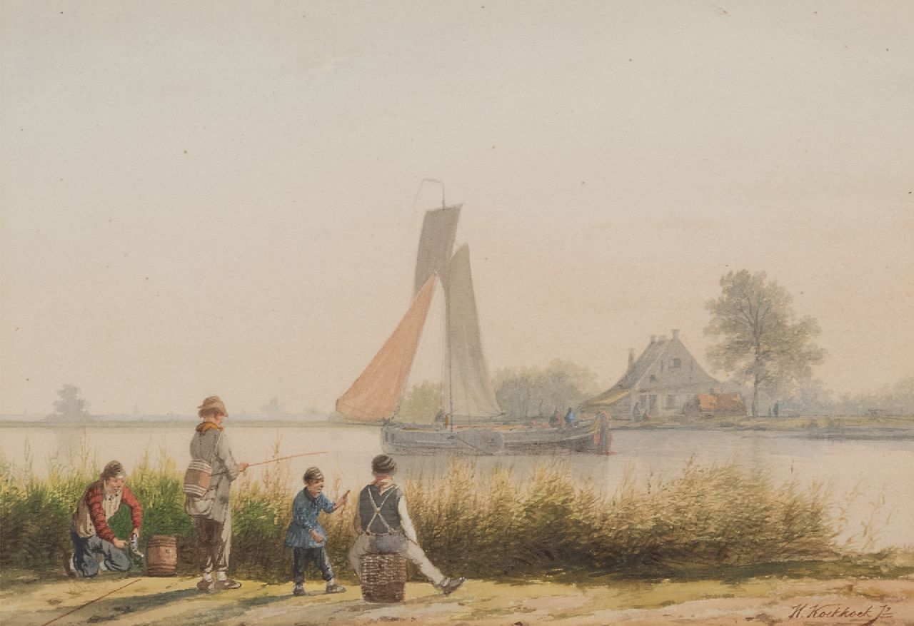 Hermanus Koekkoek jr. kunstwerk • aquarel • tekening • voorheen te koop Vissende kinderen langs een rivieroever
